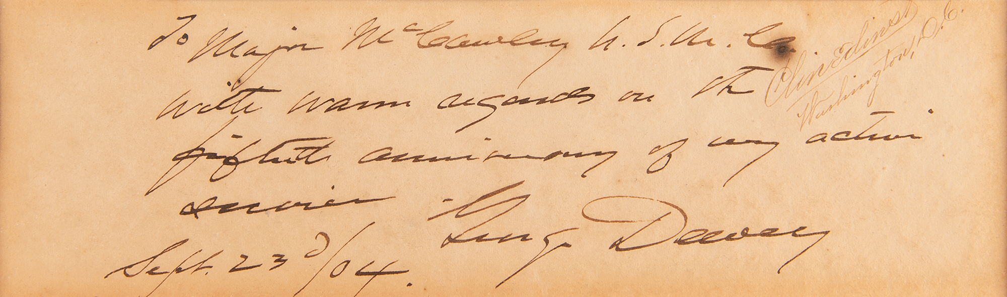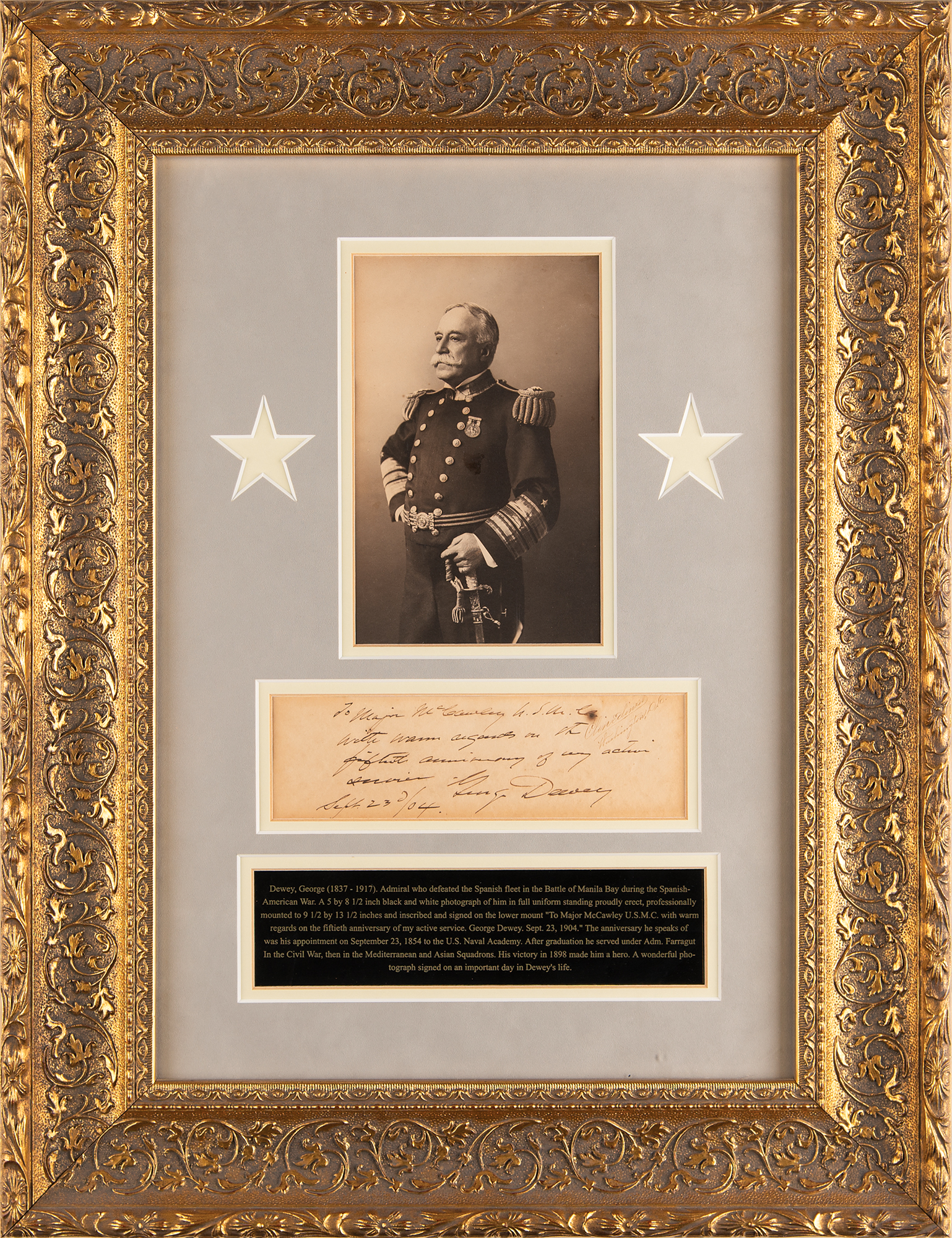 Ink signature and inscription, "To Major McCawley U.S.M.C., with warm regards on the fiftieth anniversary of my active service, George Dewey, Sept. 23, 1904," on an off-white 8 x 2.5 photographer's mount. Ornately double-suede-matted and framed with a portrait of Dewey and a biographical plaque to an overall size of 18 x 24. In fine condition.