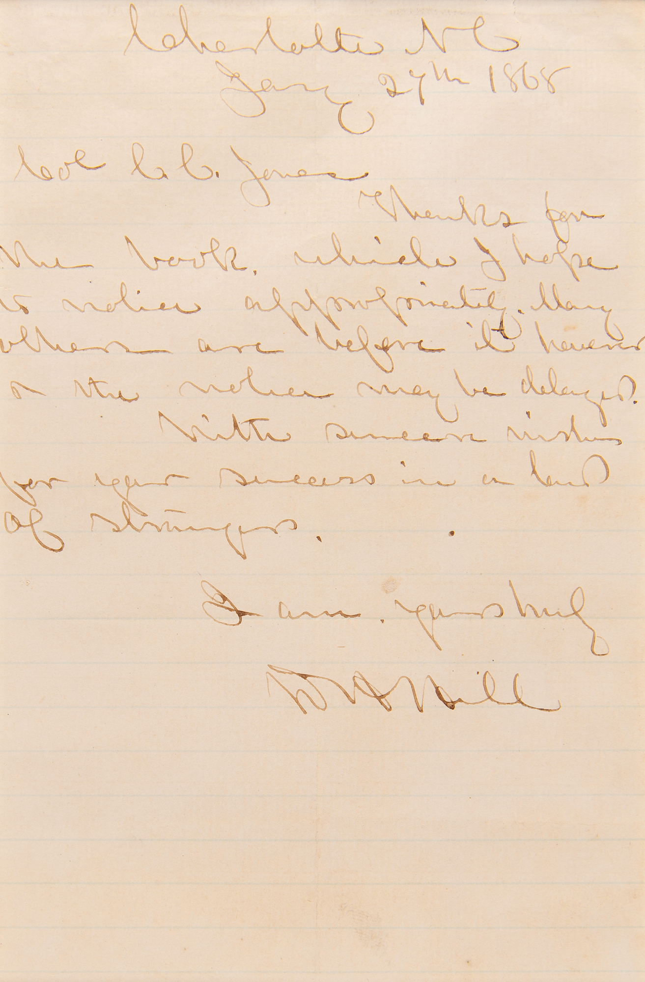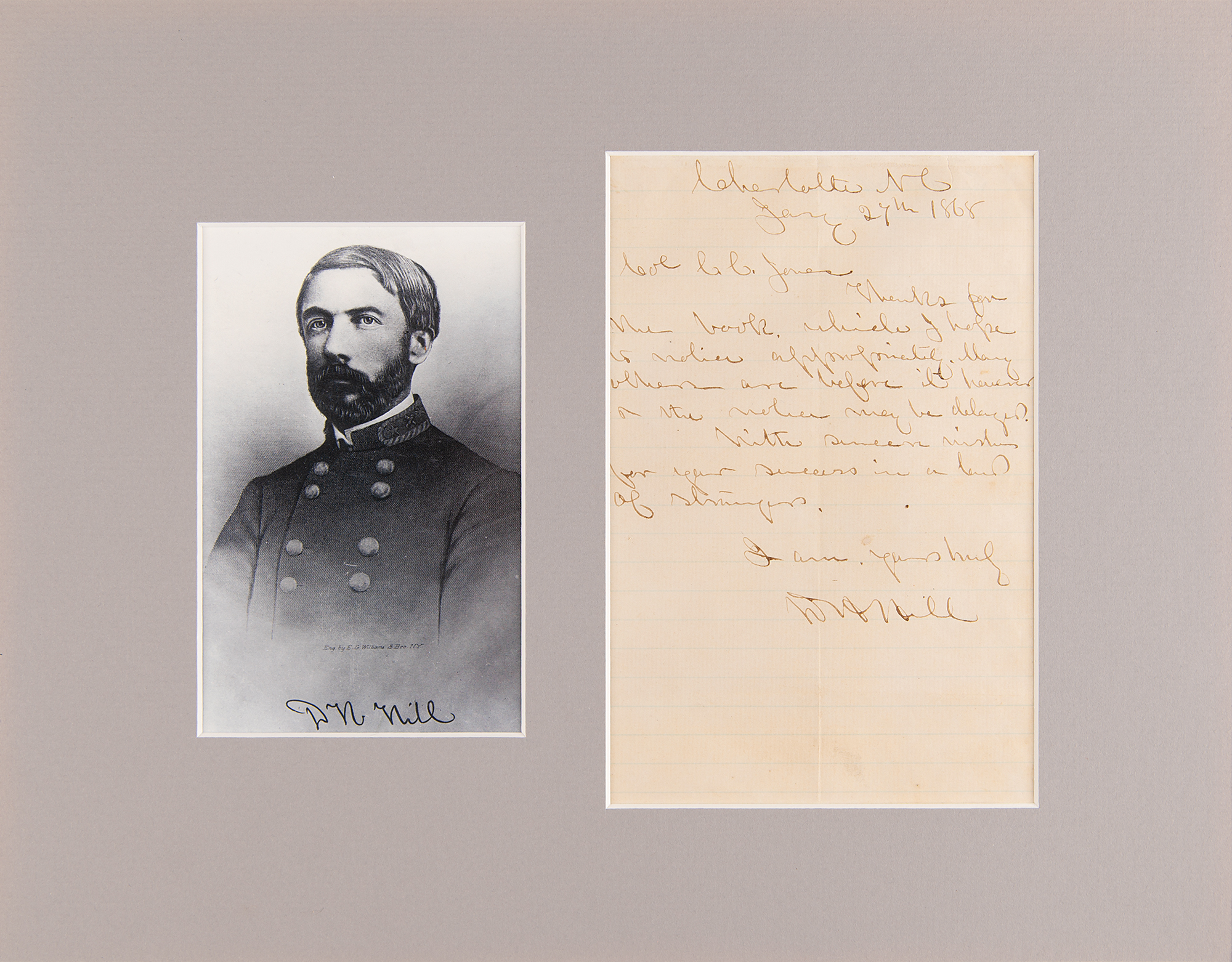 Confederate General (1821–1889) and brother-in-law of Thomas 'Stonewall' Jackson. ALS signed "D. H. Hill," one page, lightly-lined, 5 x 7.5, January 17, 1868. Handwritten letter to Colonel C. C. Jones. In part: "Thanks for the book…Many others are before it however…may be delayed." Matted with a portrait (featuring a facsimile signature) to an overall size of 14 x 11. In fine condition, with central vertical and horizontal folds and light toning.