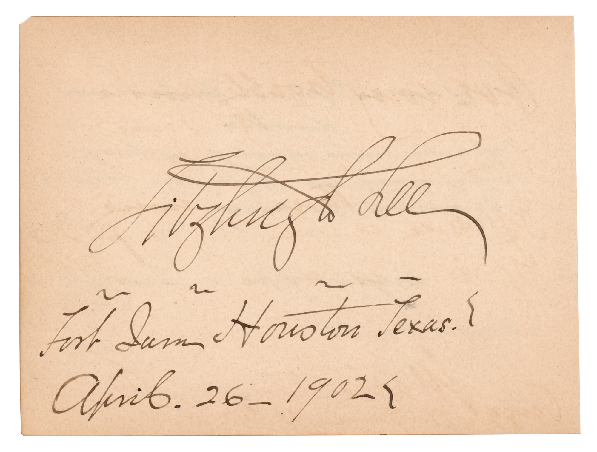American soldier and politician (1835-1905), nephew of Robert E. Lee, who was a Confederate cavalry general during the Civil War and a general during the Spanish-American War. In the interval between the two wars, Lee served as Governor of Virginia and Consul General at Havana. Ink signature, "Fitzhugh Lee, Fort Sam Houston, Texas, April 26-1902," on an off-white 5.25 x 4 album page. In fine condition, with some light show-through from an unrelated signature on the back.