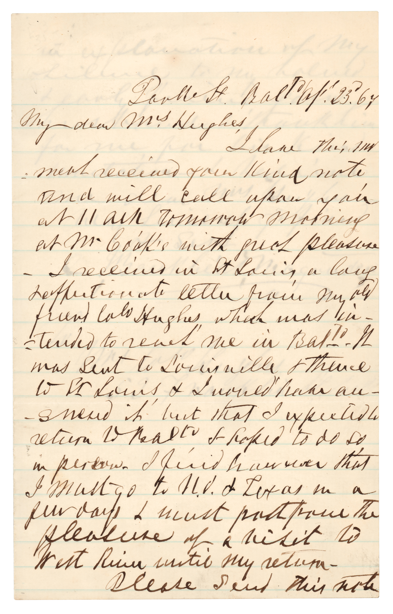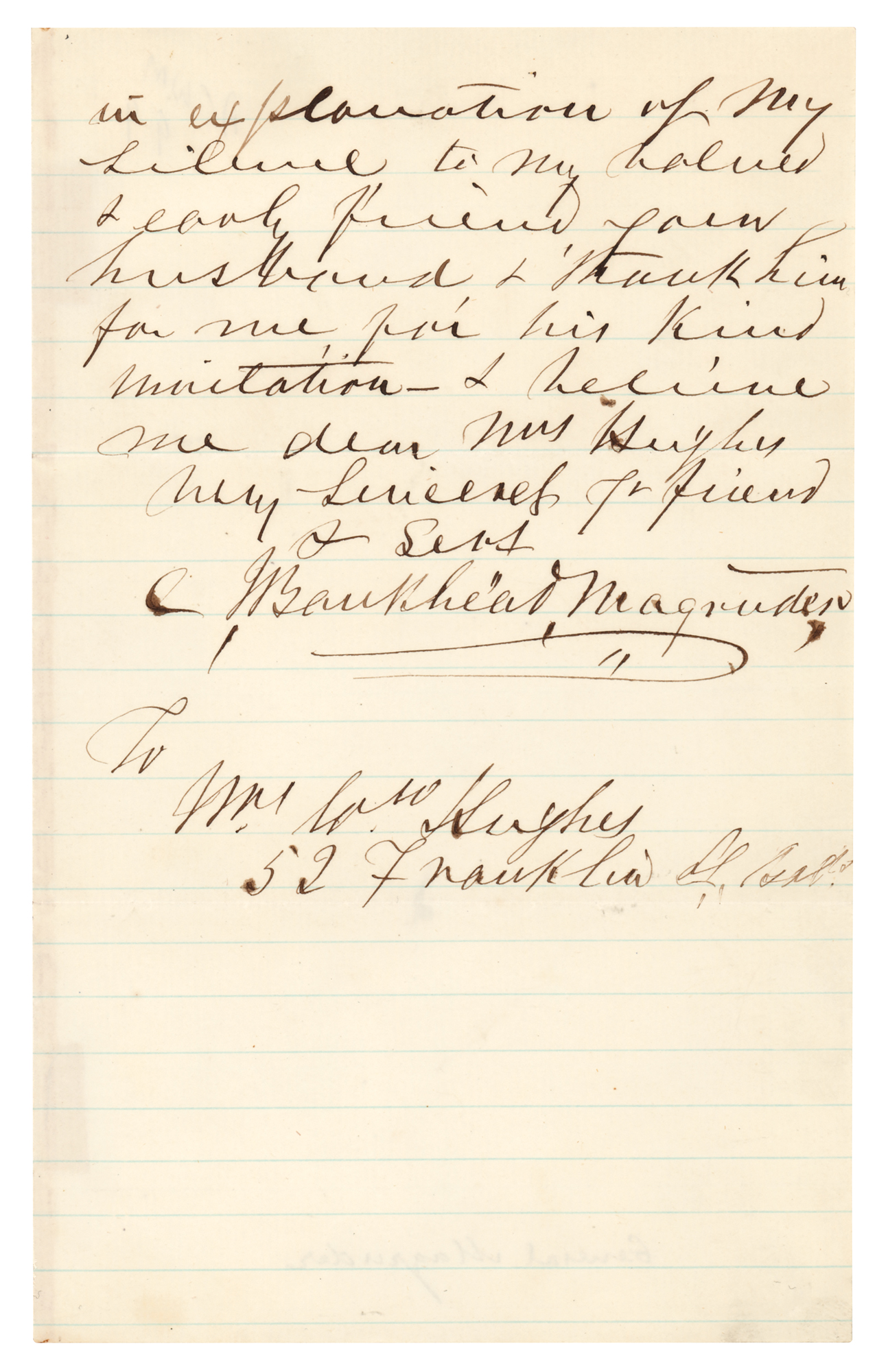 Career army officer (1807–1871) who served with distinction in the US Army in the Mexican-American War, as a Confederate general in the Civil War, and as a postbellum general in the Imperial Mexican Army. As a Confederate general, 'Prince John' routed Union forces at Big Bethel and recaptured Galveston in a daring attack in January 1863. ALS signed "J. Bankhead Magruder," two pages on two adjoining sheets, 5 x 8, April 23, 1867. Handwritten letter to William Hughes, in part: "I have this moment received your kind note and will call upon you at Mr. Cook's with great pleasure-I received in St. Louis a loving & effectionate [sic] letter from my old friend Wm. Hughes, which was intended to reach me in…Louisville & thence to St. Louis & I would have answered it but that I expected to return…to do so in person. I find however that I must go to…Texas in a few days. I must postpone the pleasure of a visit to West River until my return." In fine condition.