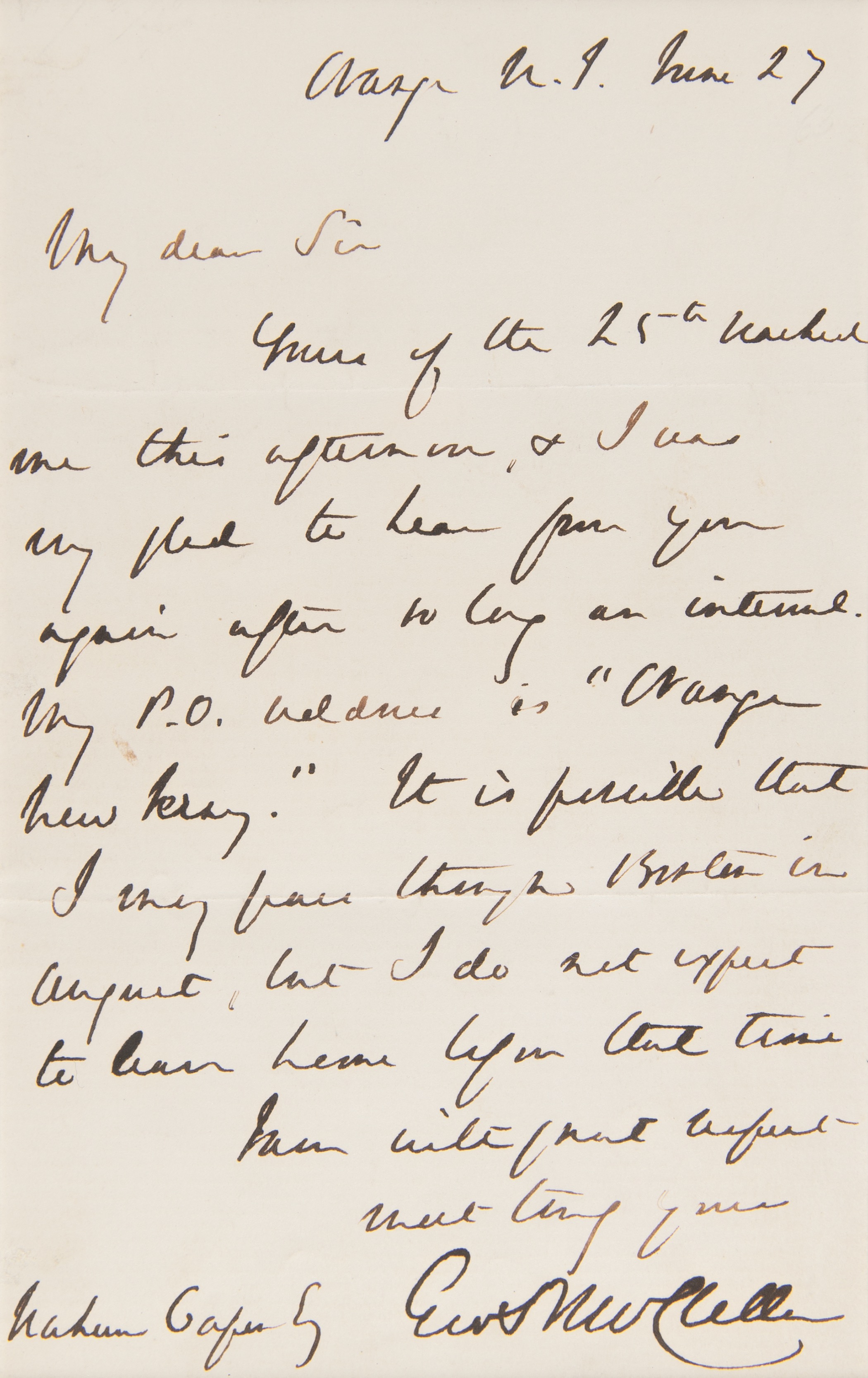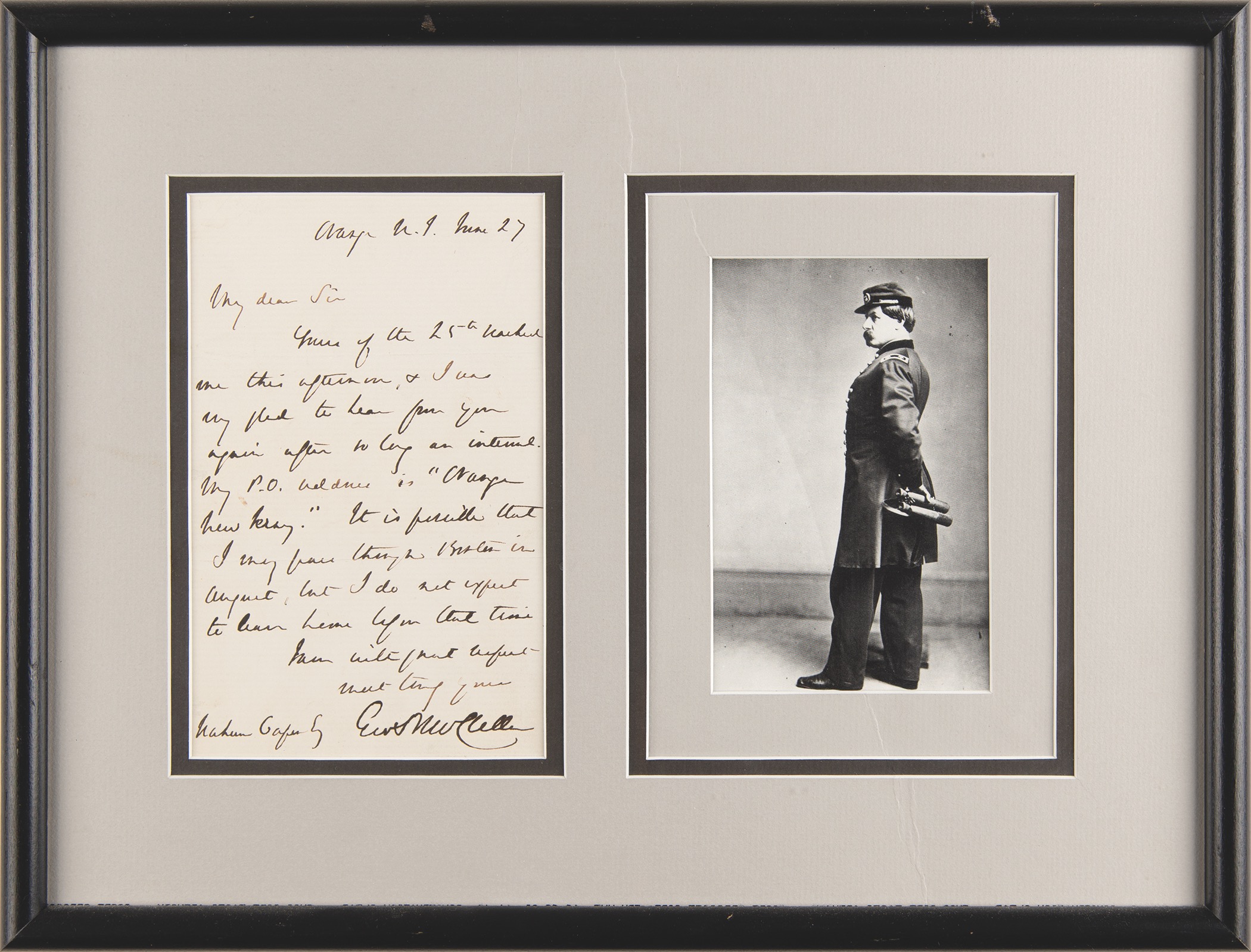 Union general (1826-1885) removed from command by Lincoln for his failure to exert pressure on Lee's army during the crucial Peninsula Campaign. He ran unsuccessfully for the presidency in 1864 and later served as Governor of New Jersey. ALS signed "Geo. B. McClellan," one page, 4.75 x 7.5, June 27, [no year]. Handwritten letter to a gentleman, in part: "I was very glad to hear from you again after so long an interval…. It is possible that I may pass through Boston in August, but I do not expect to leave home before that time." Matted and framed with a photo to an overall size of 17 x 13. In fine condition.