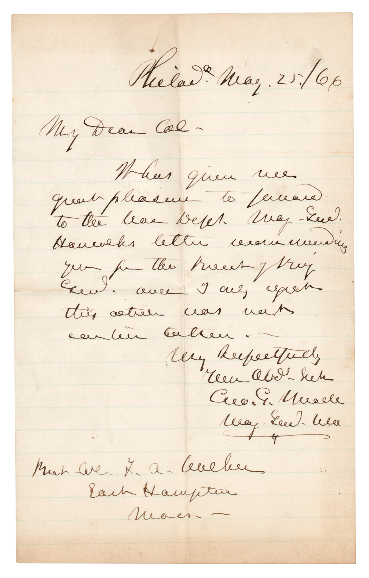 Union general (1815–1872) best known for leading his troops to a commanding victory over Lee's Confederates at Gettysburg. ALS signed "Geo. G. Meade, Maj. Genl. USA," one page, 5 x 8, May 25, 1866. Handwritten letter to Colonel F. A. Walker, in part: "It has given me great pleasure to forward to the War Dept. Maj. Genl. Hancock's letter recommending you for the Brevet of Brig. Genl." In fine condition, with some light edge toning.