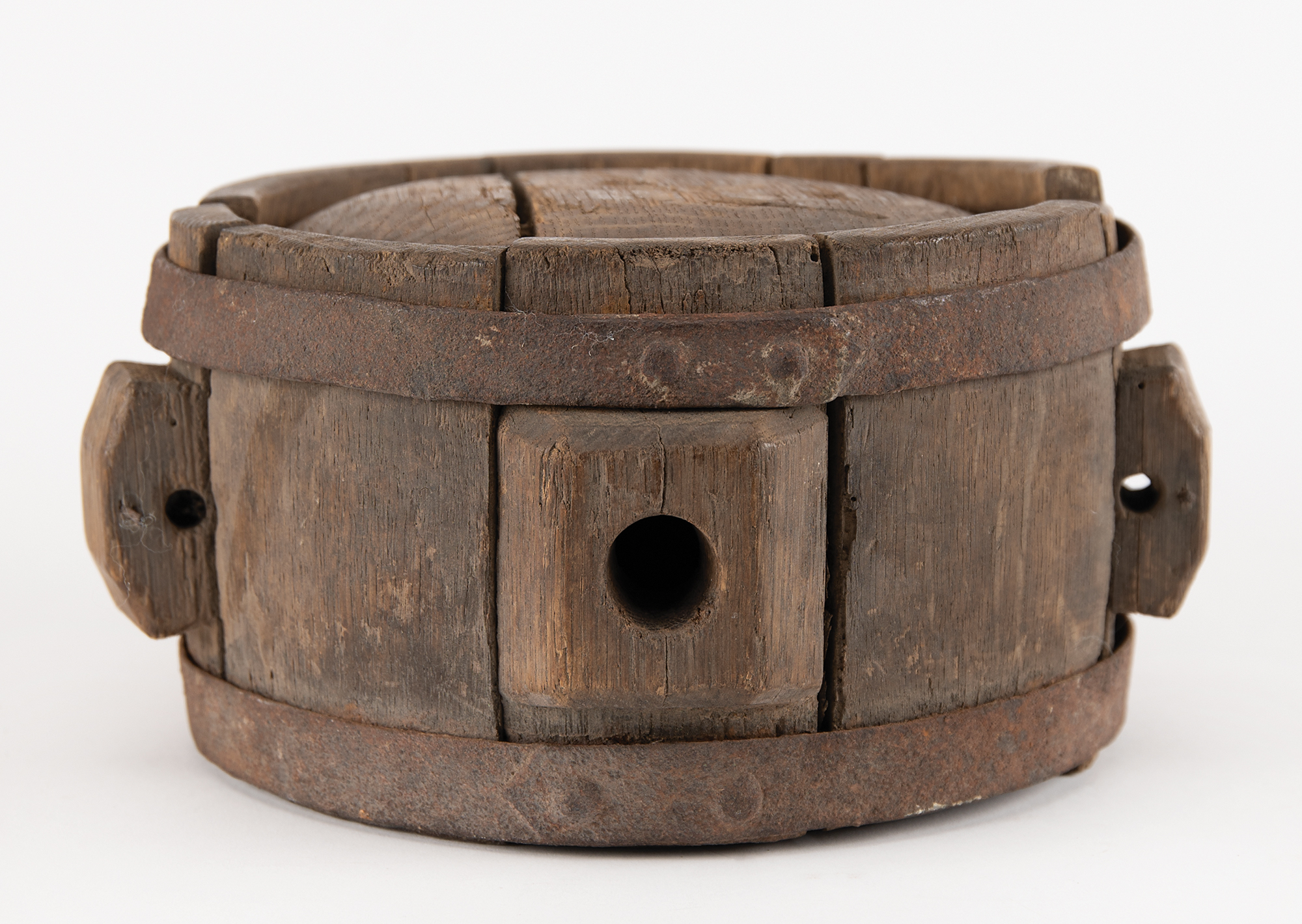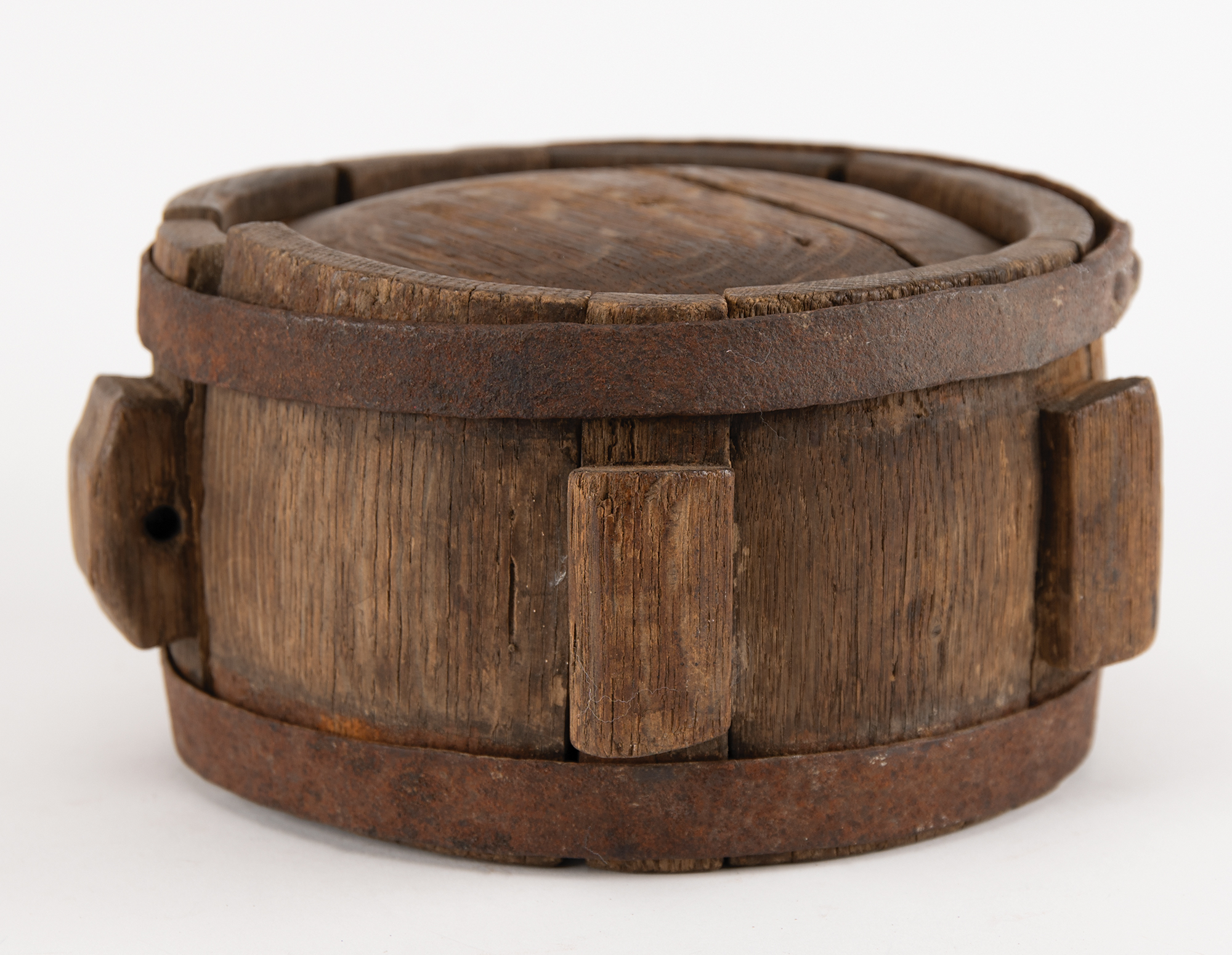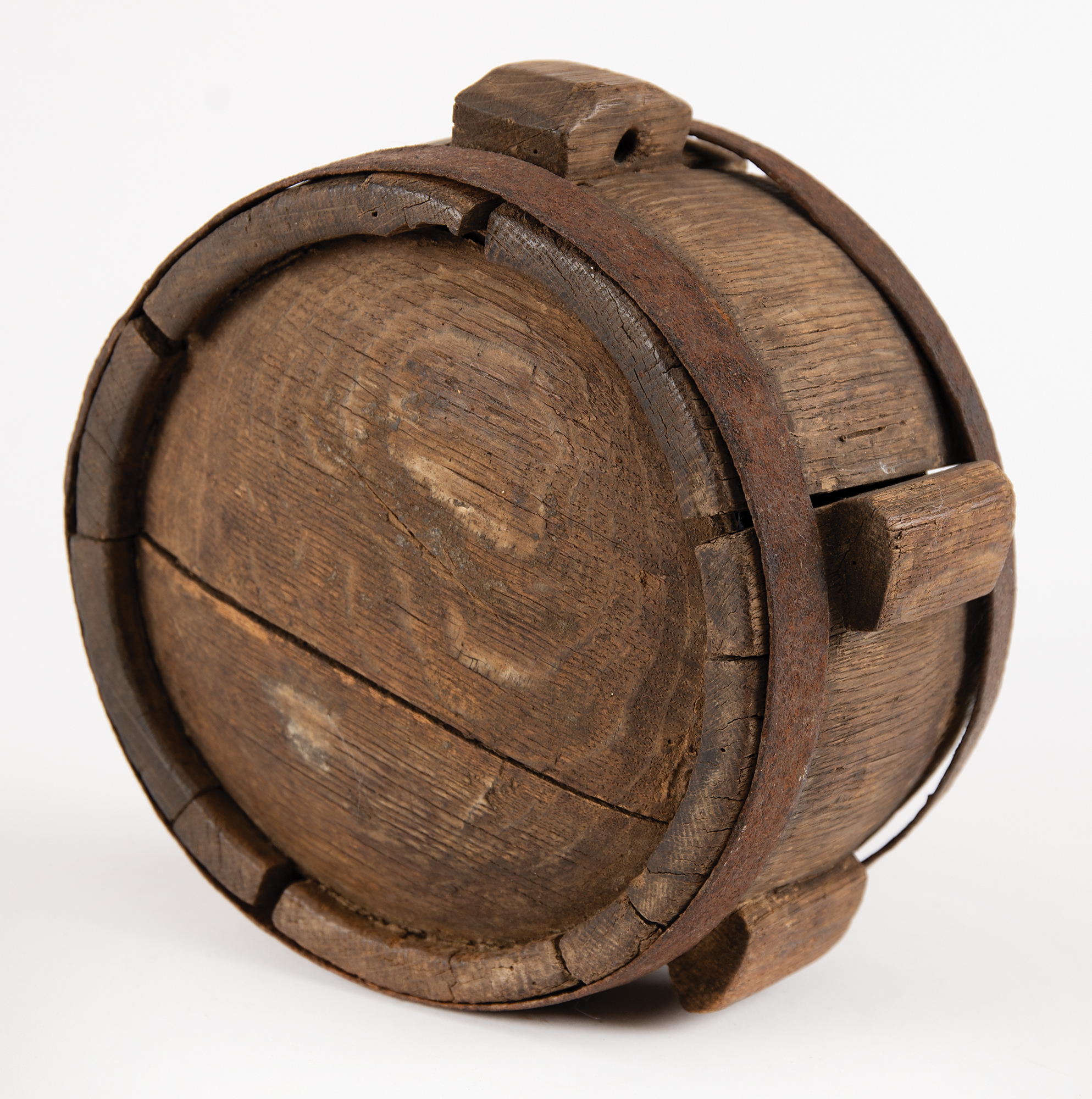 Revolutionary War-era wooden canteen, measuring approximately 8˝ in diameter by 4.75˝ thick, encompassed by two metal bands. Exhibits expected weathering and wear from age and use, a missing plug for the drinking spout, and loose sideboards held in place by the metal bands, otherwise very good condition.