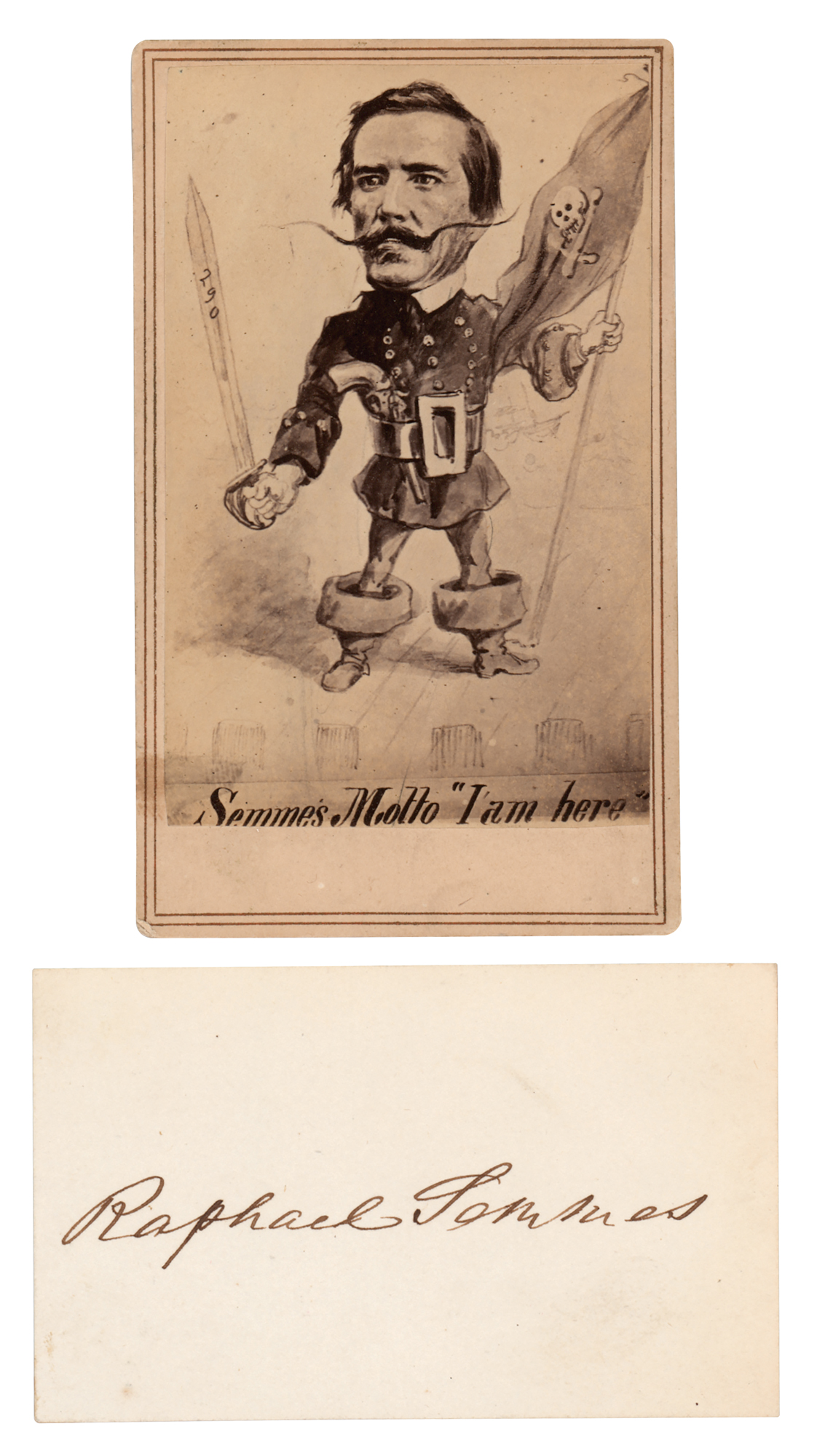 Confederate naval commander (1809-1877) who was captain of the famous commerce raider CSS Alabama, taking a record 69 prizes. Ink signature, "Raphael Semmes," on an off-white 3.25 x 2 card. In very fine condition. Accompanied by an unsigned original carte-de-visite featuring a cartoon of Semmes.
