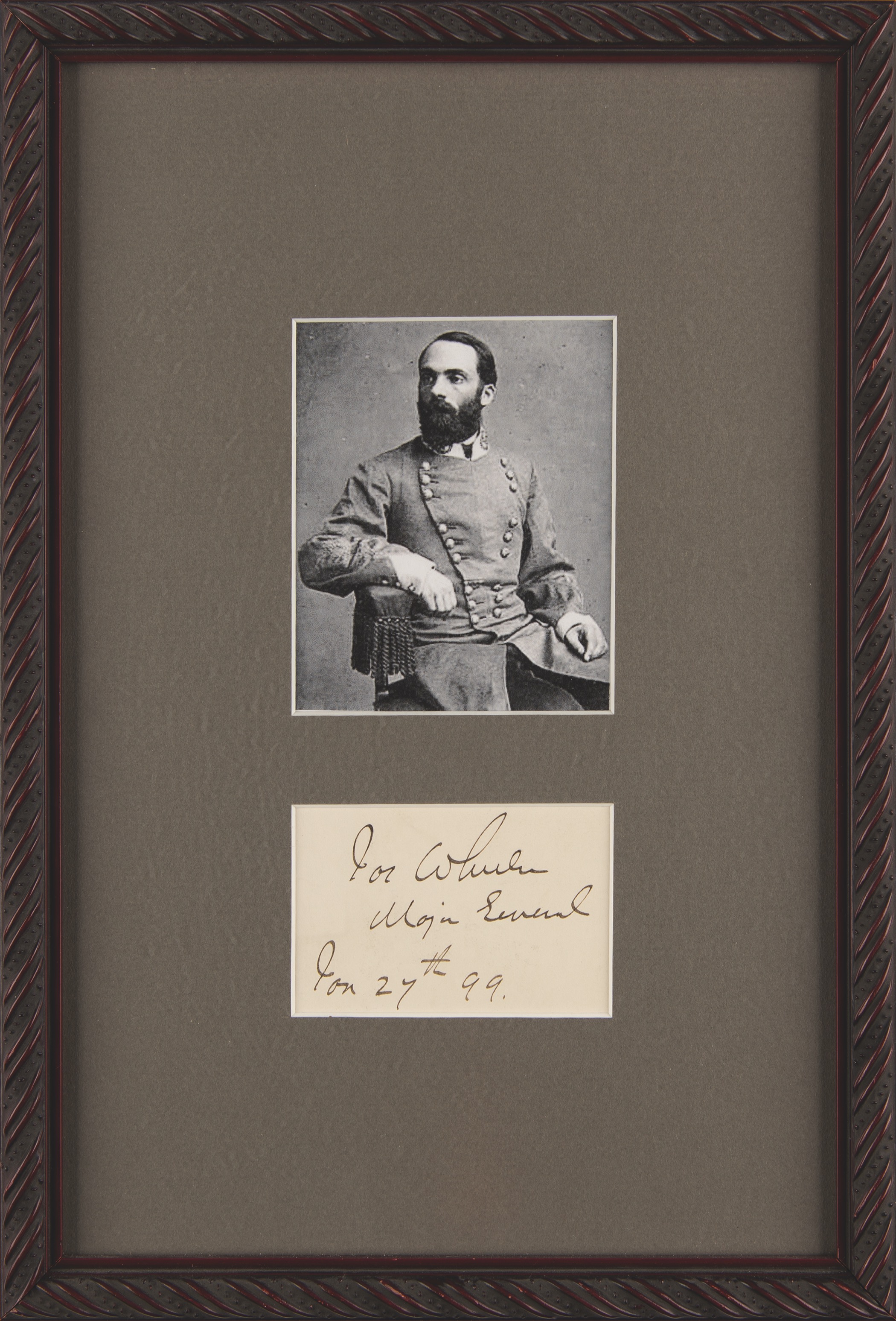 Confederate major general (1836-1906), known as 'Fightin' Joe,' who led his troops in vigorous opposition to Sherman during the Atlanta campaign. Bold ink signature, "Jos. Wheeler, Major General, Jan 27th 99," on an off-white 3 x 2 card, matted and framed with a portrait to an overall size of 8.5 x 12.5. In fine condition.