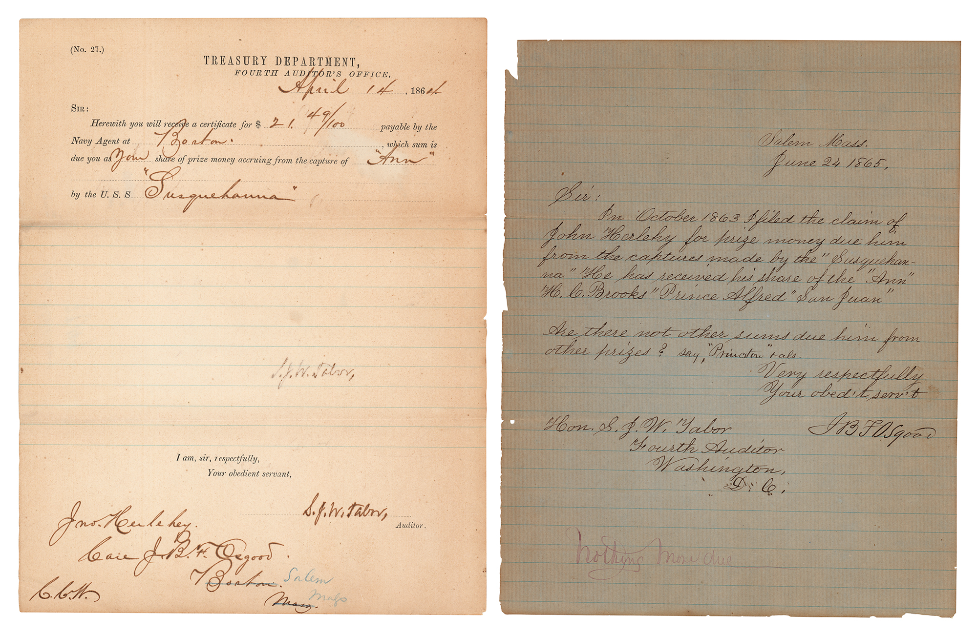 - a DS, signed by a US Treasury auditor, "S.J.W. Tabor," one page, 8 x 10.25, Treasury Office letterhead, April 14, 1864, to John Herlehy, in part: "Herewith you will receive a certificate for $21.49 payable by the Navy Agent at Boston, which sum is due you as your share of prize money accruing from the capture of 'Ann' by the U.S.S. Susquehanna."