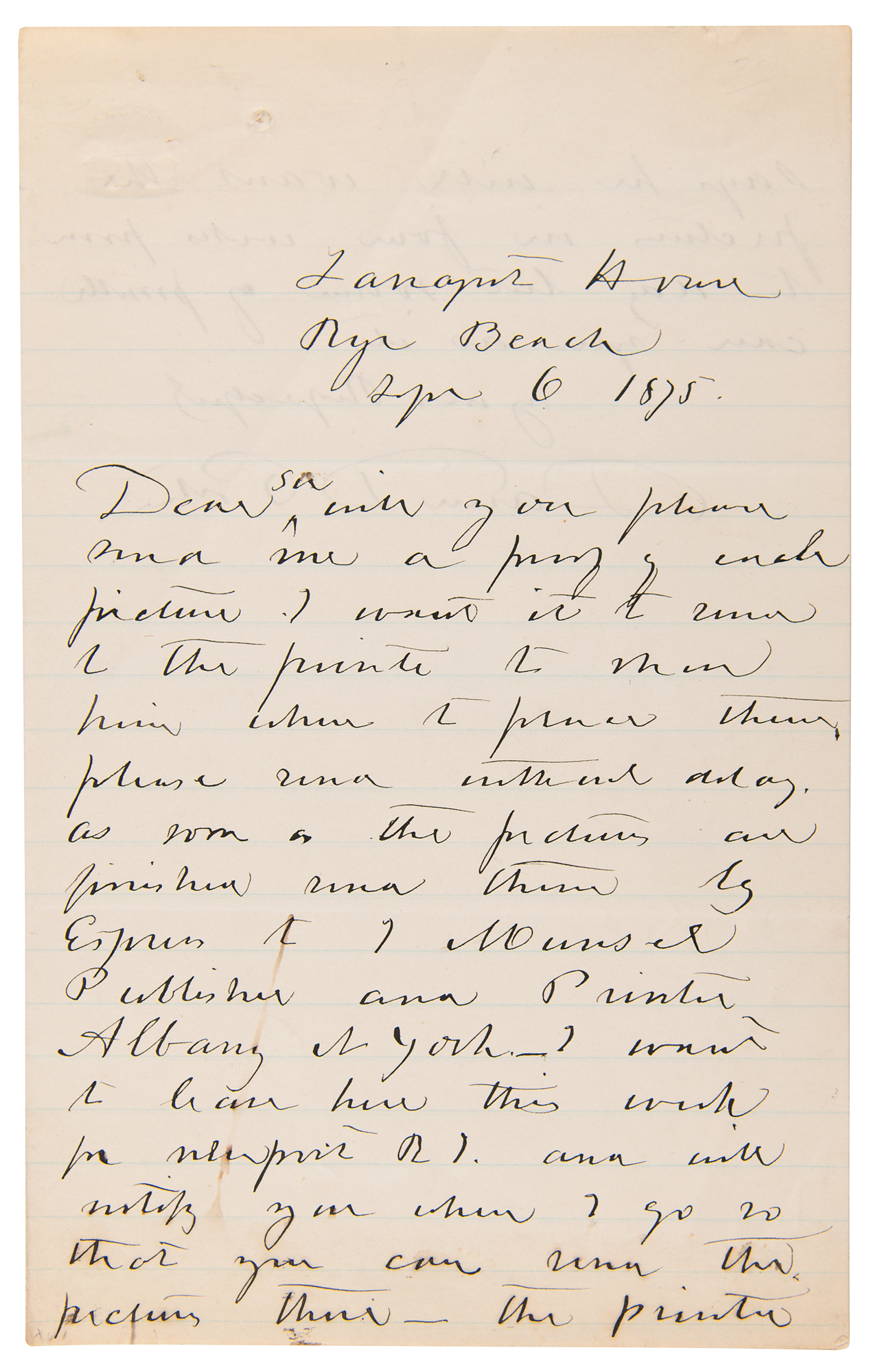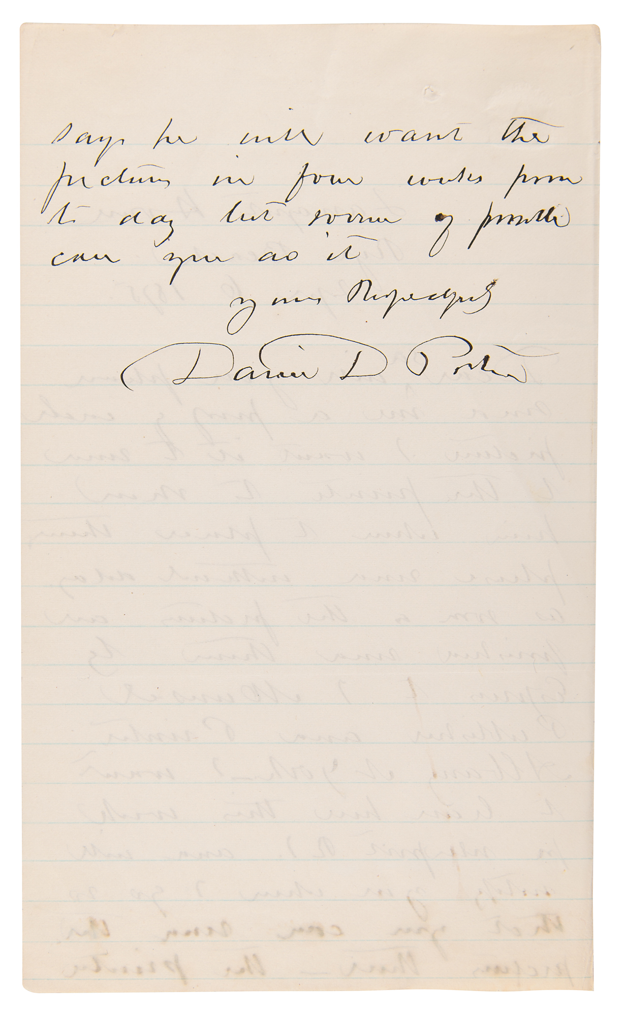 Admiral (1813-1891) who helped improve the Navy as the superintendent of the US Naval Academy after significant service in the American Civil War. ALS, one page both sides, 5 x 8, September 6, 1875. Handwritten letter to a gentleman, in part: "Will you please send me a proof of each picture. I want it to send to the printer to show him where to place them. Please send without delay. As soon as the pictures are finished send them by Express to J. Munsell Publisher and Printer Albany N. York…the printer says he will want the pictures in four weeks from to day but sooner if possible." In fine condition. Accompanied by an unsigned hardcover book entitled "A Memorial of David Dixon Porter from the city of Boston," published in 1891, exhibiting moderate to heavy overall wear.