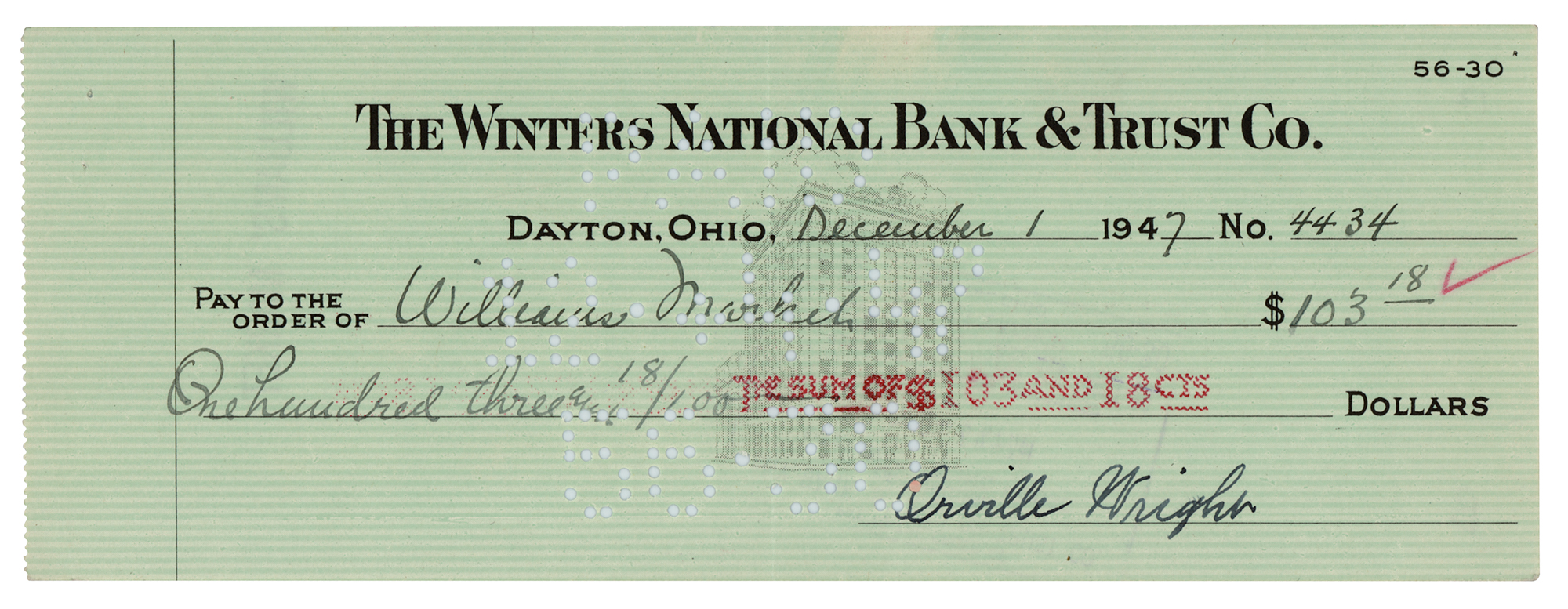 Winters National Bank & Trust check, 8.5 x 3, filled out in another hand and signed by Wright, "Orville Wright," payable to William's Market for $103.18, December 1, 1947. In fine condition.