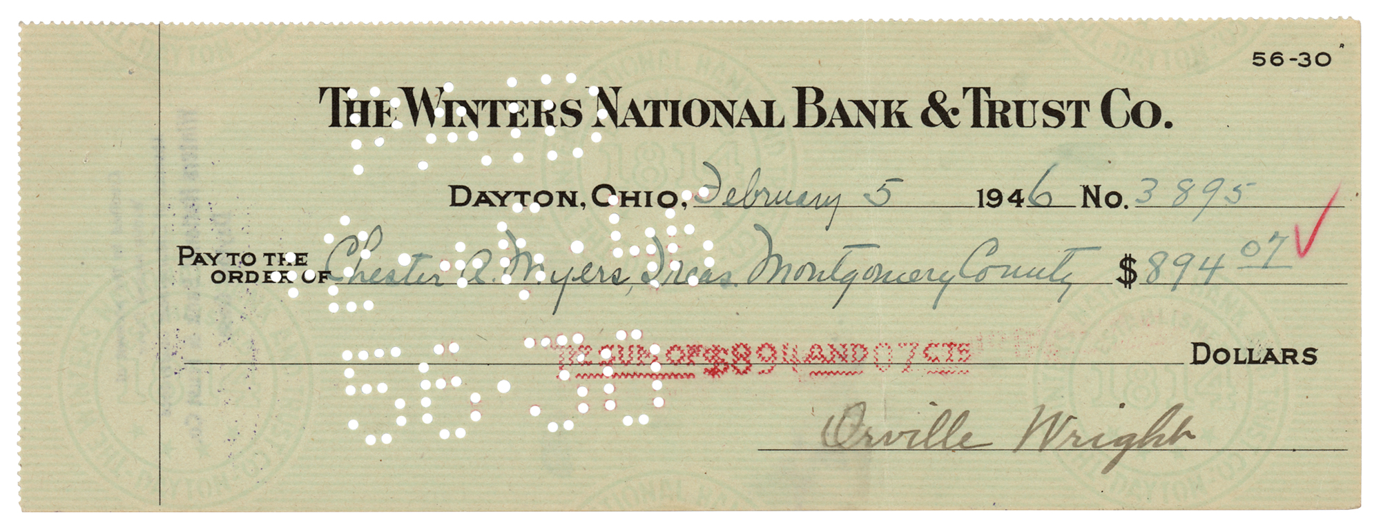 The Winters National Bank & Trust Co. check, 8.5 x 3, filled out in another hand and signed by Wright, "Orville Wright," payable to Chester A. Meyers, Treas. Montgomery County for $894.07, February 5, 1946. In fine condition.