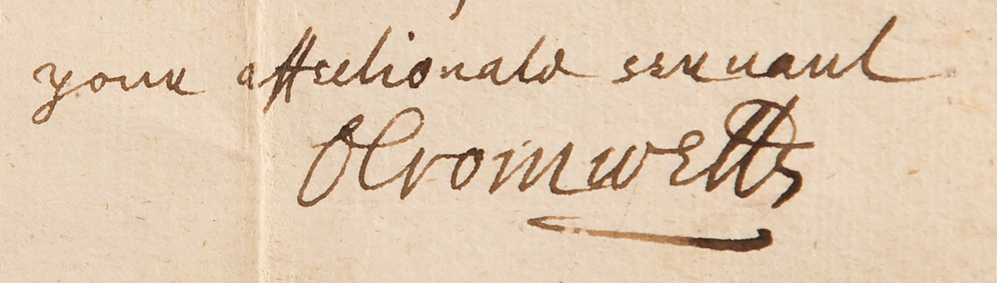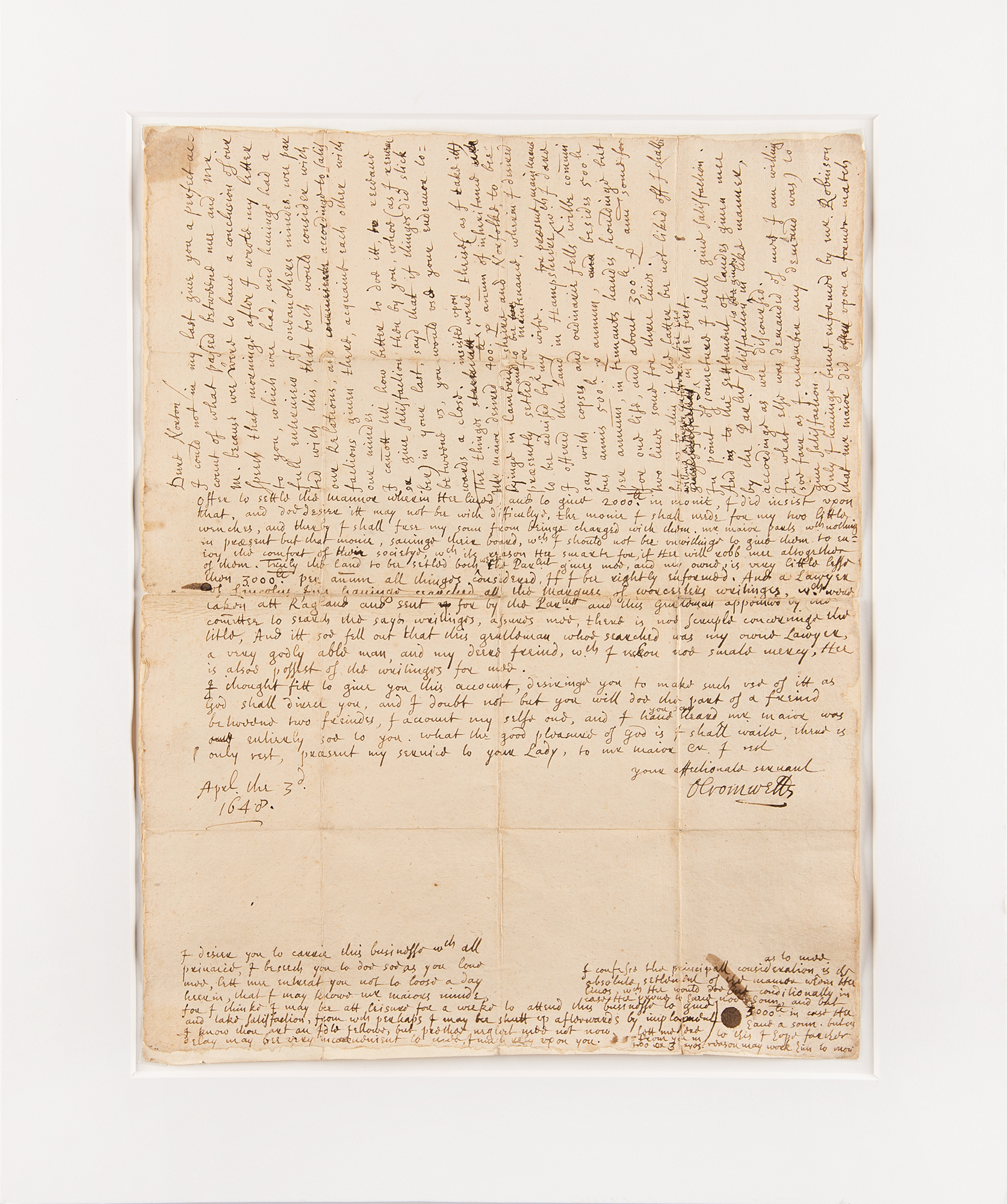 ALS signed “O. Cromwell,” two pages on two adjoining sheets, unfolded to 15.75 x 12, April 3, 1648. Large, lengthy handwritten letter to Colonel Richard Norton, aiming to expedite the negotiations for the marriage of his son, Richard Cromwell, to Dorothy Maijor, the daughter of Richard Maijor, a member of the Hampshire gentry. In part: "I could not in my last give you a perfect account of what passed between me and Mr. M[aijor] because we were to have a conclusion of our speed that morning after I wrote my letter to you. Which we had, and having had a full interview of one another's minds, we parted with this, that both would consider with our relations, and according to satisfactions given there, acquaint each other with our minds…