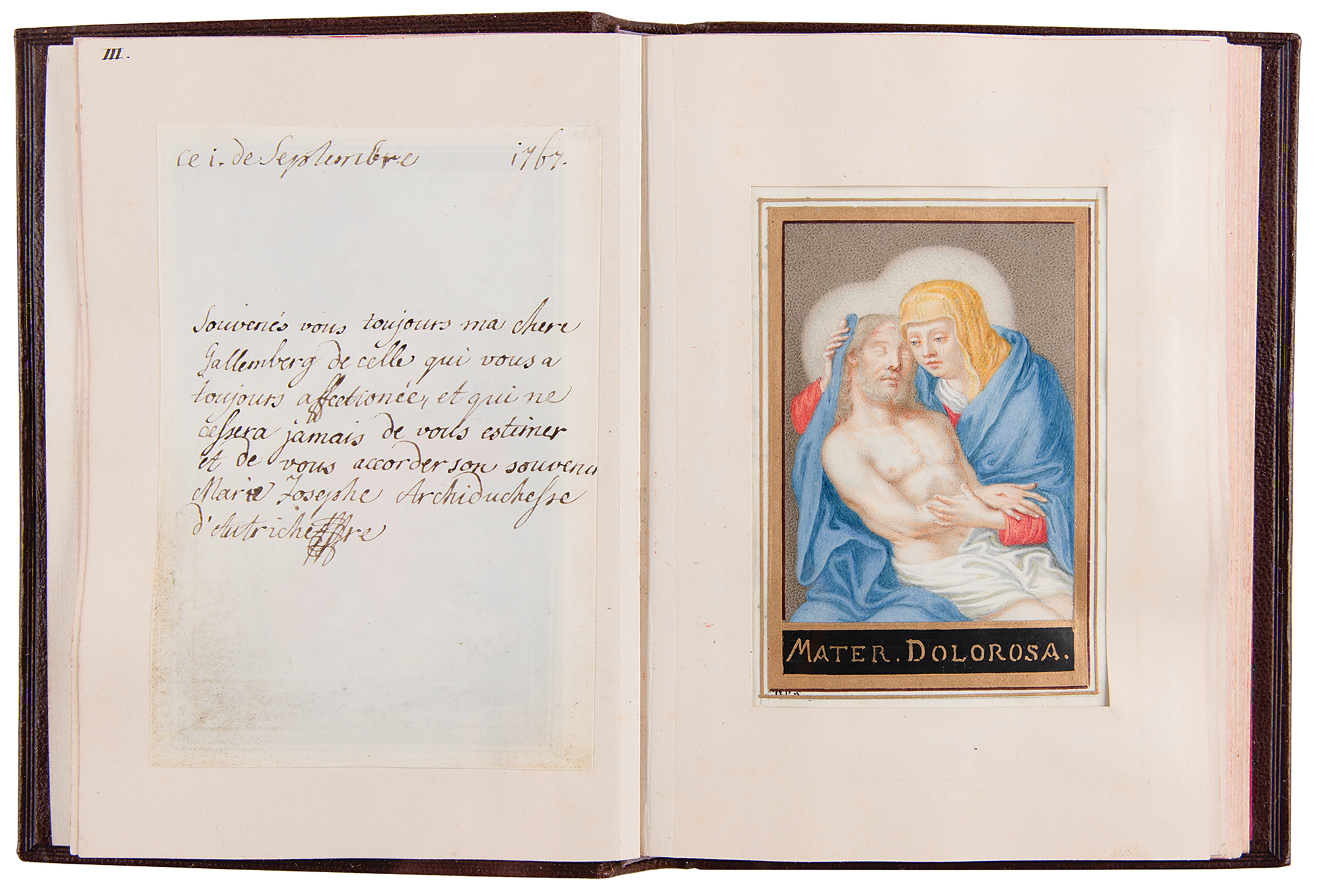 Unique book of nine hand-painted devotional miniatures of outstanding quality, each signed and inscribed on the reverse by an archduchess of Austria—highlighted by Marie Antoinette—carefully mounted under mats and bound in calf of the late 19th century, with a manuscript description of the contents in the rear. The book measures 5 x 7.