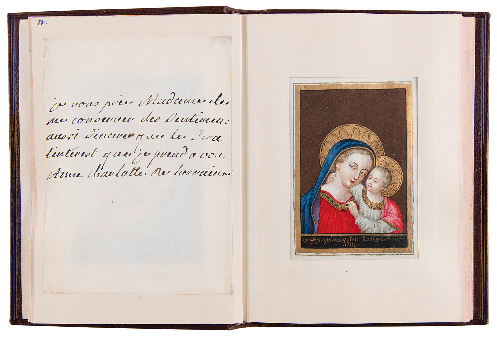 5) The Virgin and Child ("Du Königin des guten Raths bitt für uns"), 5-line inscription signed by Maria Theresa's eldest daughter, Archduchess Maria Anna (1738-89), dated 1757.