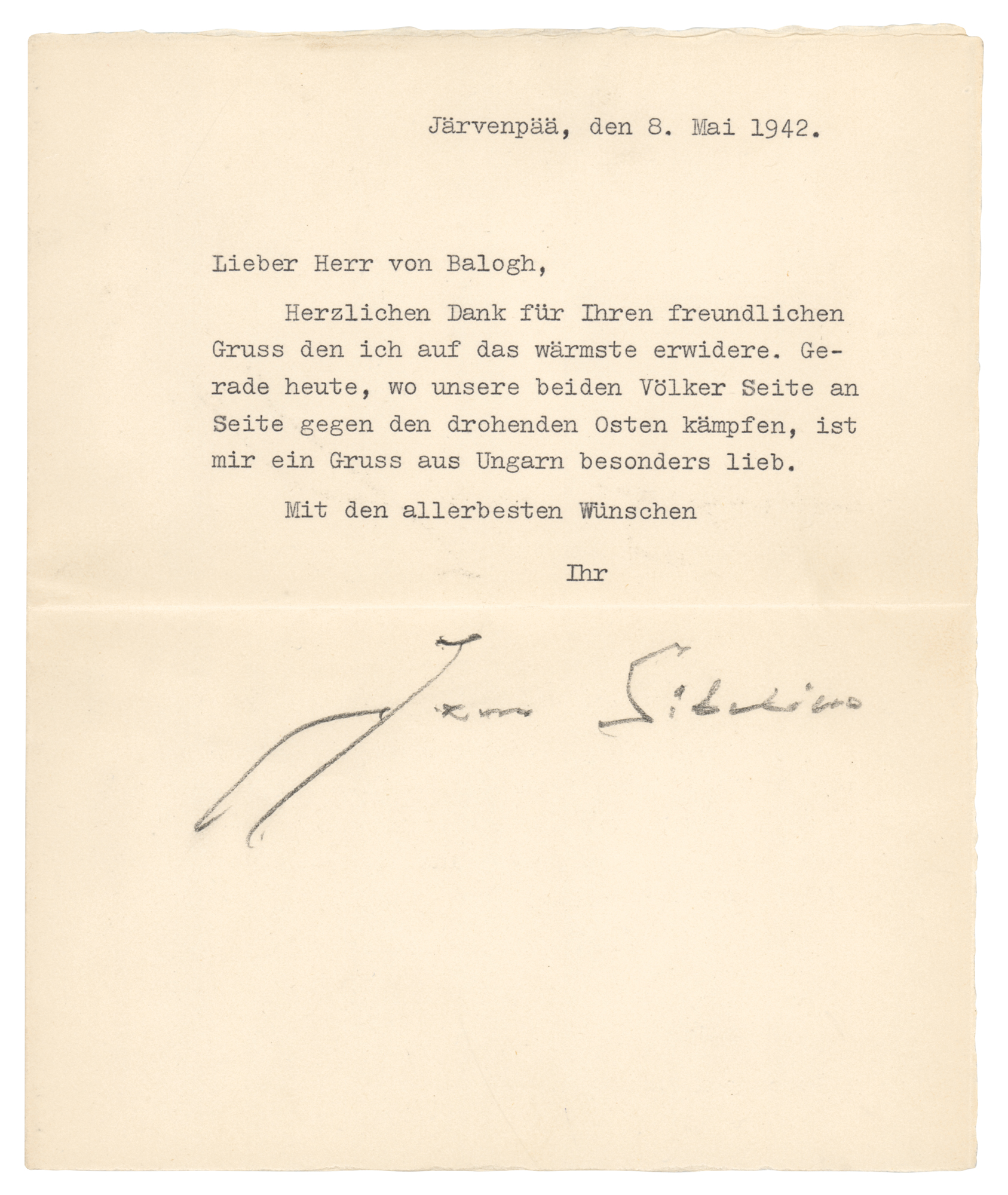 Distinguished Finnish composer (1865–1957) of Romantic-nationalistic tendencies, best known for his seven completed symphonies and the tone poem Finlandia. World War II-dated TLS in German, signed in pencil, one page, 6.5 x 7.75, May 8, 1942. Addressed from Jarvenpaa, Finland, a letter to Paul von Balogh, in full (translated): “Thank you very much for your friendly greeting, which I return most warmly. Especially today, when our two countries people are fighting side by side against the threatening East, a greeting from Hungary is particularly dear to me.” In fine condition. Accompanied by the original mailing envelope.