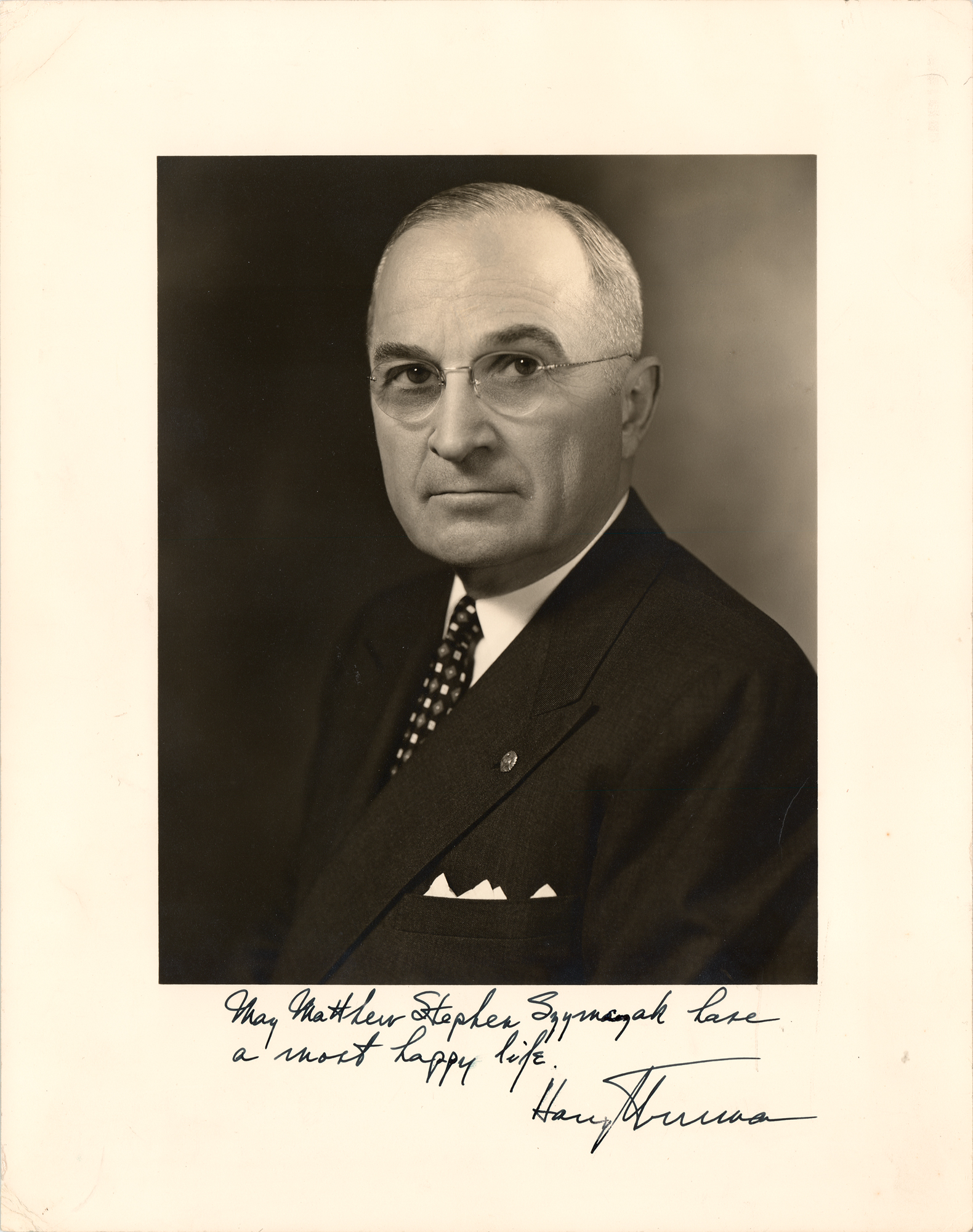 Vintage matte-finish 11 x 13.75 photo of Harry Truman in a crystal-clear bust-length pose, signed and inscribed in the lower border in fountain pen as president, "May Matthew Stephen Szymczak have a most happy life, Harry S. Truman.” Collector notation to the reverse dates the signature to December 25, 1952. In very good to fine condition, with creasing to the corner tips, and light silvering to the darker areas of the image.