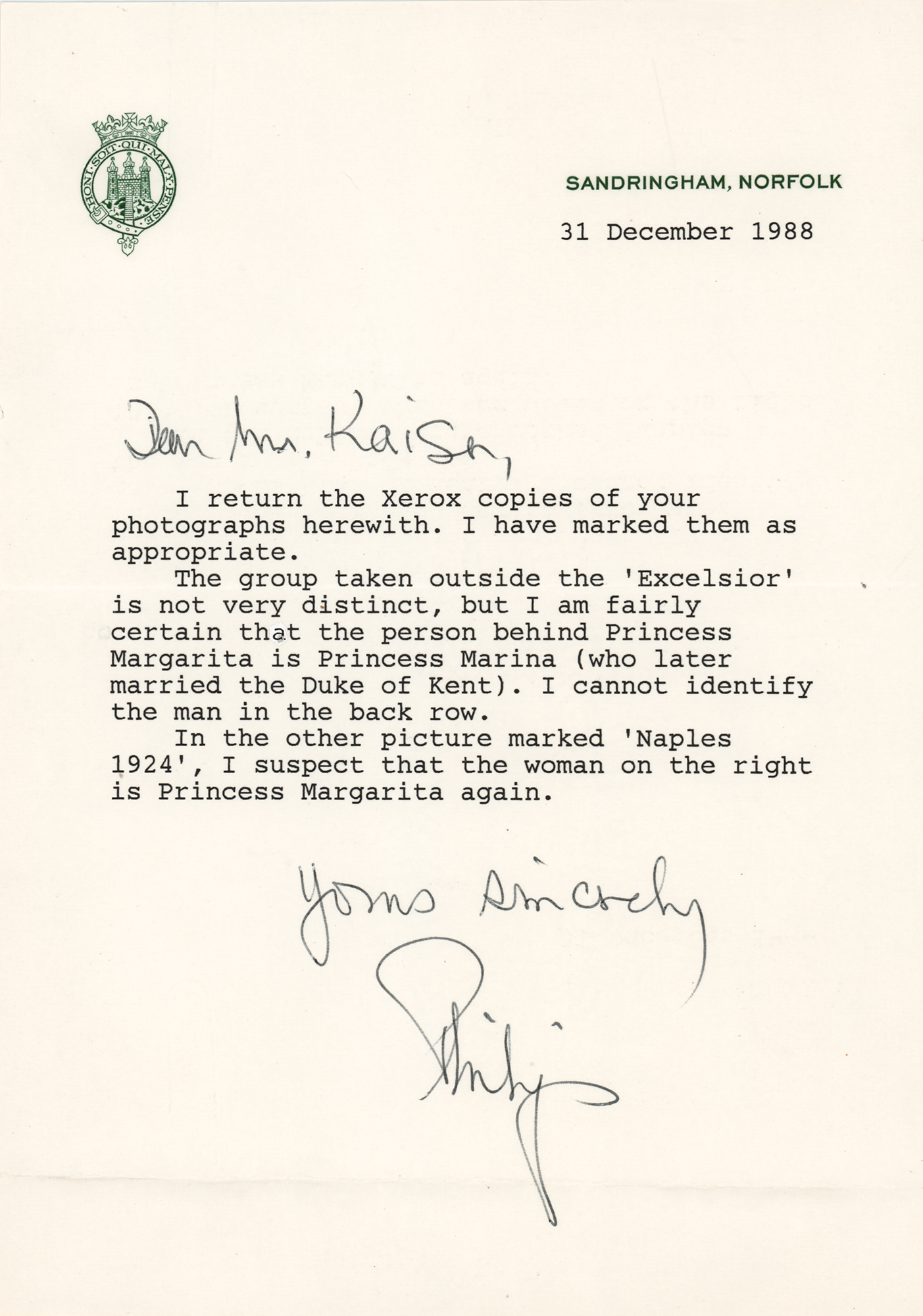 TLS signed “Yours sincerely, Philip,” one page, 5.75 x 8.25, personal letterhead, December 31, 1988. Letter to Alfred Kaiser, in full: “I return the Xerox copies of your photographs herewith. I have marked them as appropriate. The group taken outside the 'Excelsior' is not very distinct, but I am fairly certain that the person behind Princess Margarita is Princess Marina (who later married the Duke of Kent). I cannot identify the man in the back row. In the other picture marked 'Naples 1924', I suspect that the woman on the right is Princess Margarita again.” Philip adds the salutation in his own hand. In fine condition. Accompanied by the original mailing envelope.