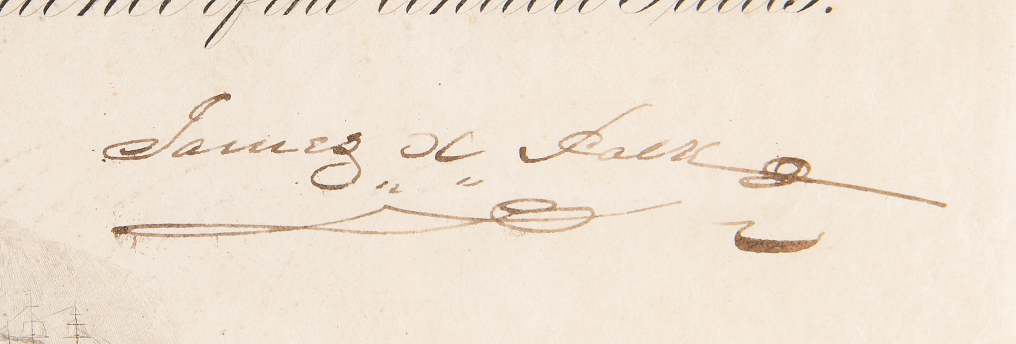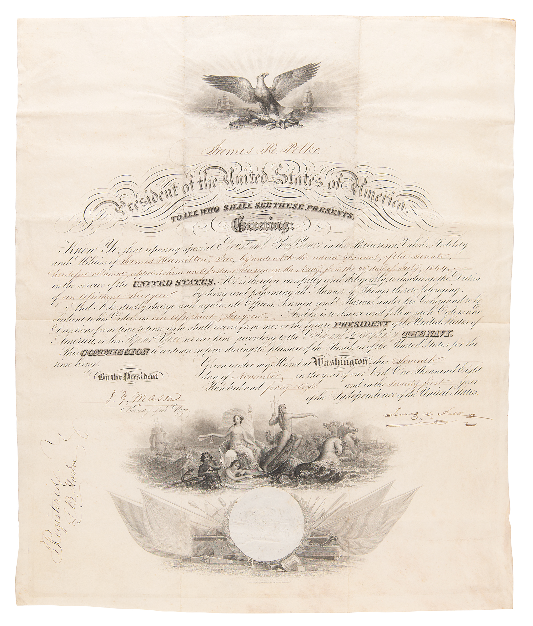Partly-printed vellum DS as president, one page, 15 x 17.75, November 7, 1846. President Polk appoints James Hamilton as "an Assistant Surgeon in the Navy." Neatly signed at the conclusion in ink by President James K. Polk, and countersigned by Secretary of the Navy John Y. Mason. The white paper seal affixed at the bottom remains intact. In fine condition.