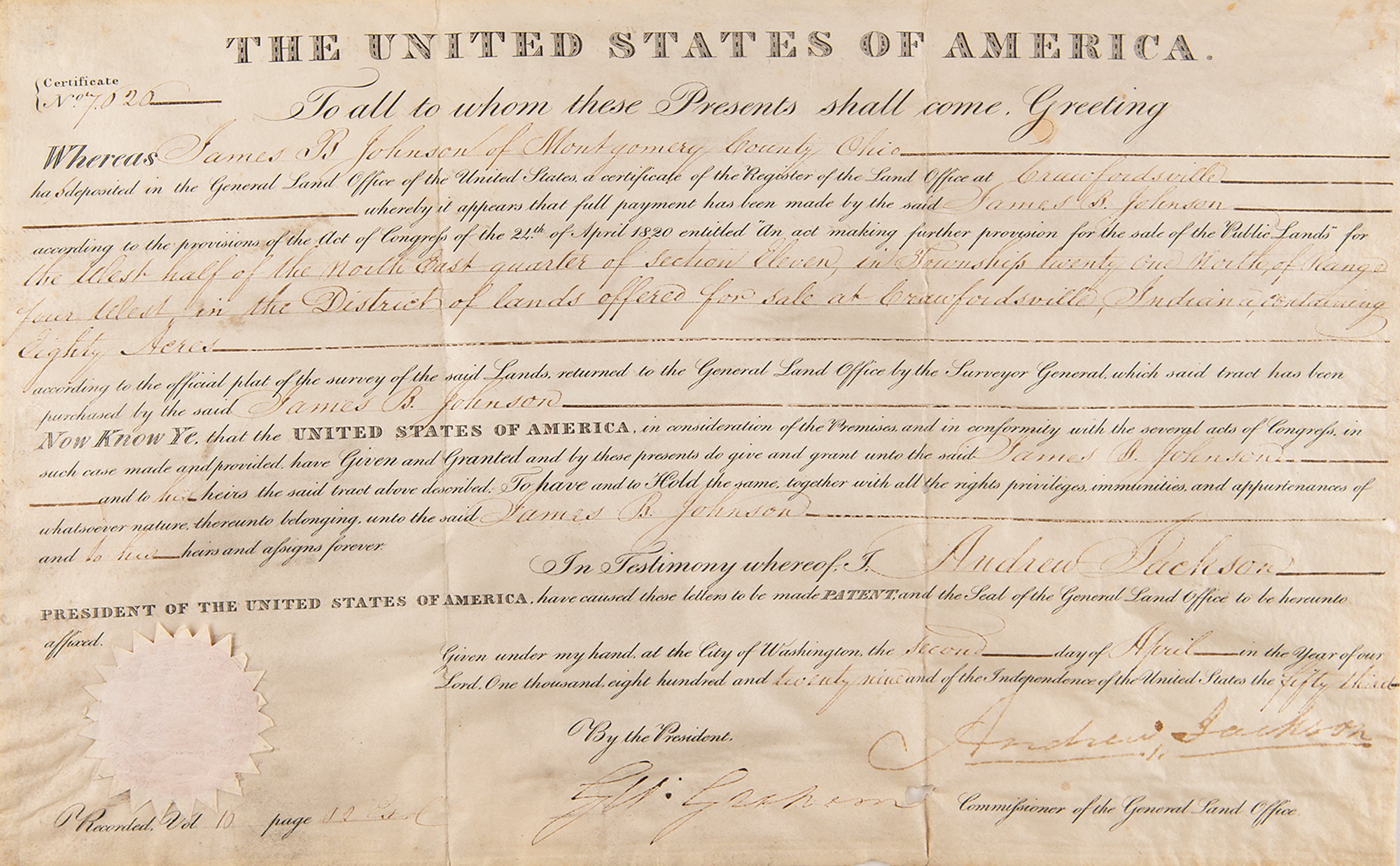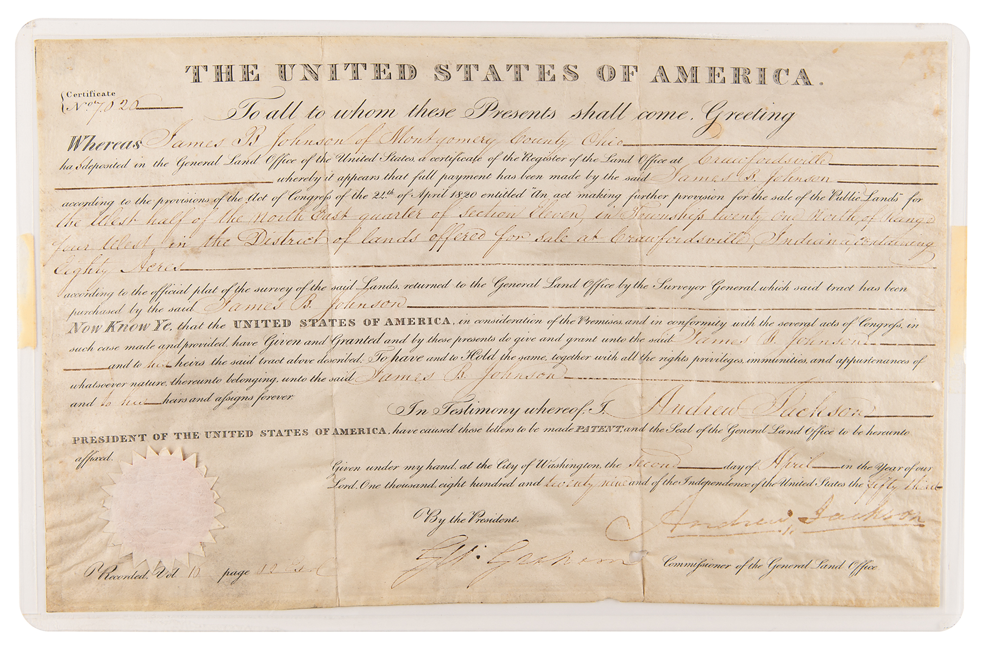 Partly-printed vellum DS as president, one page, 15.25 x 9.75, April 2, 1829. President Jackson grants James B. Johnson of Montgomery County, Ohio, a tract of land at "Crawfordsville, Indiana, containing Eighty Acres." Signed at the conclusion by President Andrew Jackson, and countersigned by Commissioner of the General Land Office George Graham. The white paper seal affixed at the lower left remains intact. In very good to fine condition, with overall rippling, and minor some loss along the folds. James B. Johnson (1796-1849), a South Carolina native, was a Quaker who married Rhonda O’Neall in Ohio and later moved the family to Indiana. The town of Crawfordsville was laid out in 1823 and incorporated in 1834. In addition to farming, Johnson was employed in commerce, likely a storekeeper.