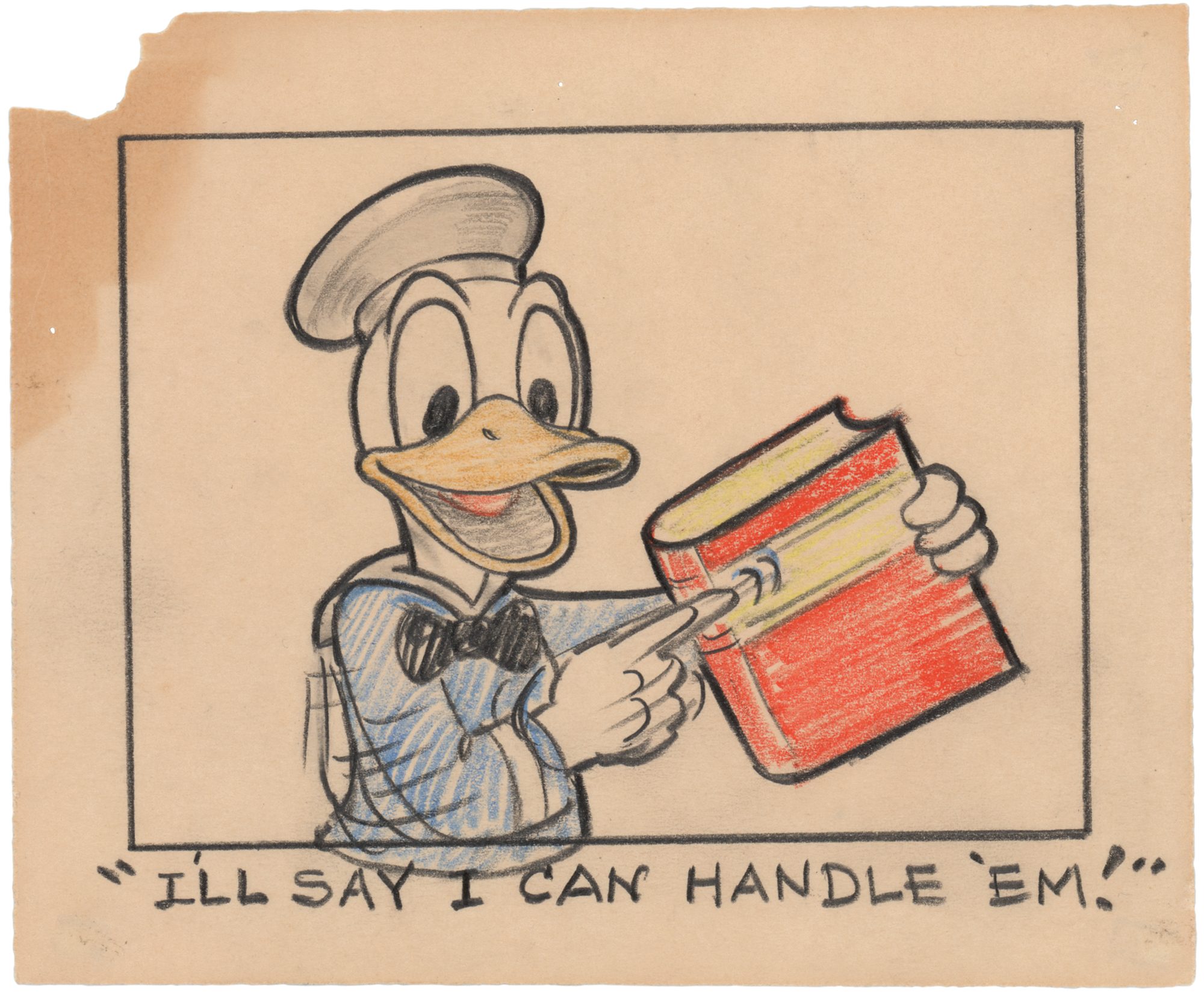 (Walt Disney Studios, 1938) Original storyboard drawing of Donald Duck from Donald's Nephews, which marked Huey, Dewey, and Louie's first appearance in animation. Accomplished in graphite and colored pencil on untrimmed 6.5 x 5.5 animation paper, the drawing shows Donald in a half-length pose holding and pointing at a book, with a handwritten caption to the lower border reading: “‘I’ll say I can handle ‘em!’” The character image measures 4 x 3.75. In very good to fine condition, with a stain to the chipped upper left corner, and pin holes to borders.