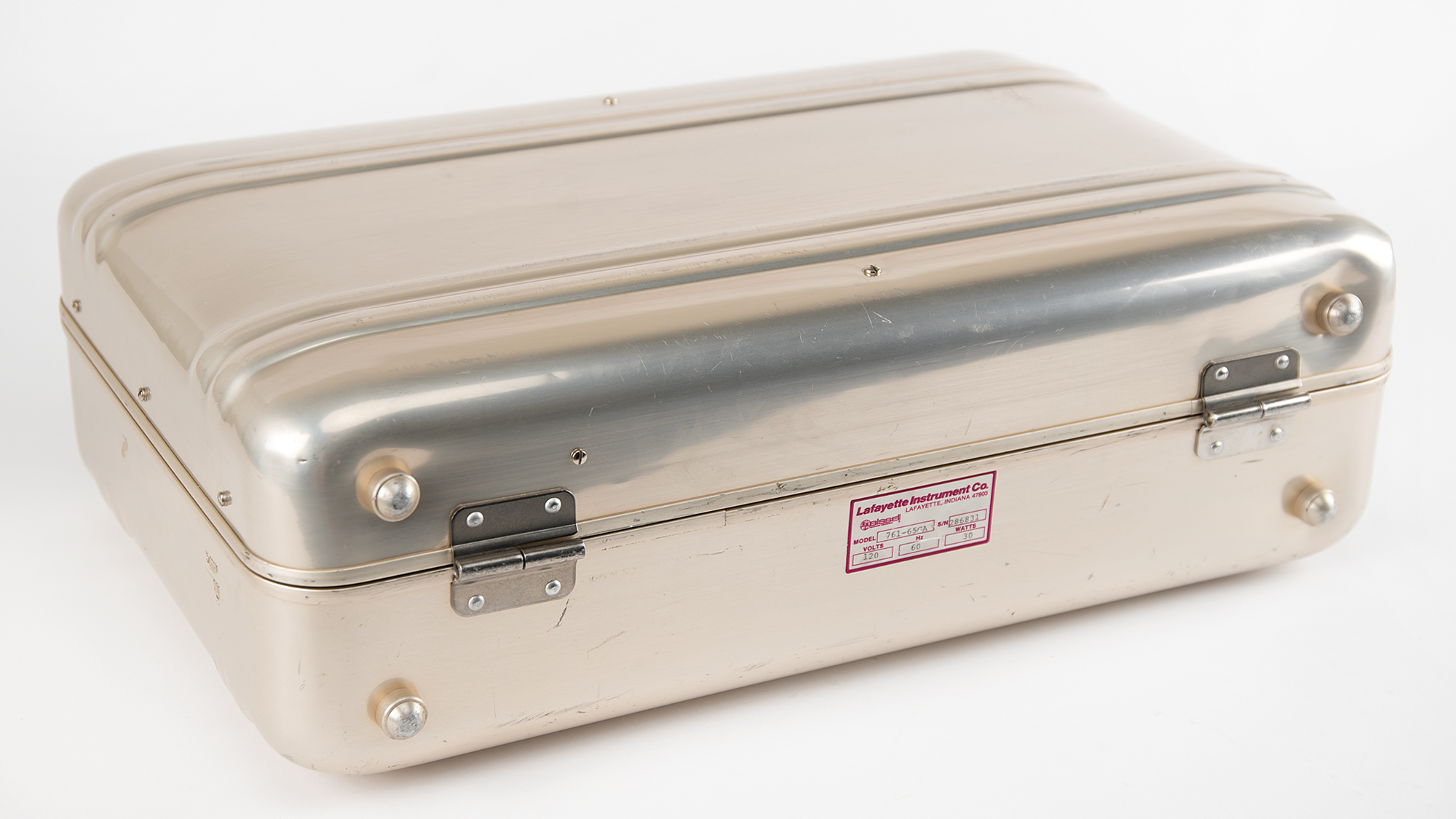 Interesting portable 'Ambassador' model portable polygraph machine built by the Lafayette Instrument Company, housed in its original 21˝ x 13.5˝ x 6.5˝ metal suitcase. The lid opens to reveal the five-channel, all mechanical polygraph with three modules marked "Cardio | Aux. | Pneumo" and one marked "Cardio | Aux. | Pneumo | GSR." A partial "U.S. Secret Servic[e]" tag is affixed at the top, and a calibrator is built into the top of the case. Untested and in fine cosmetic condition, with some wear to the case. Accompanied by assorted cables affiliated with the polygraph device, and a spare spool of polygraph chart paper. An interesting visual piece that evokes the spy games (tradecraft), espionage tactics of the Cold War, and law enforcement 'lie detection.'