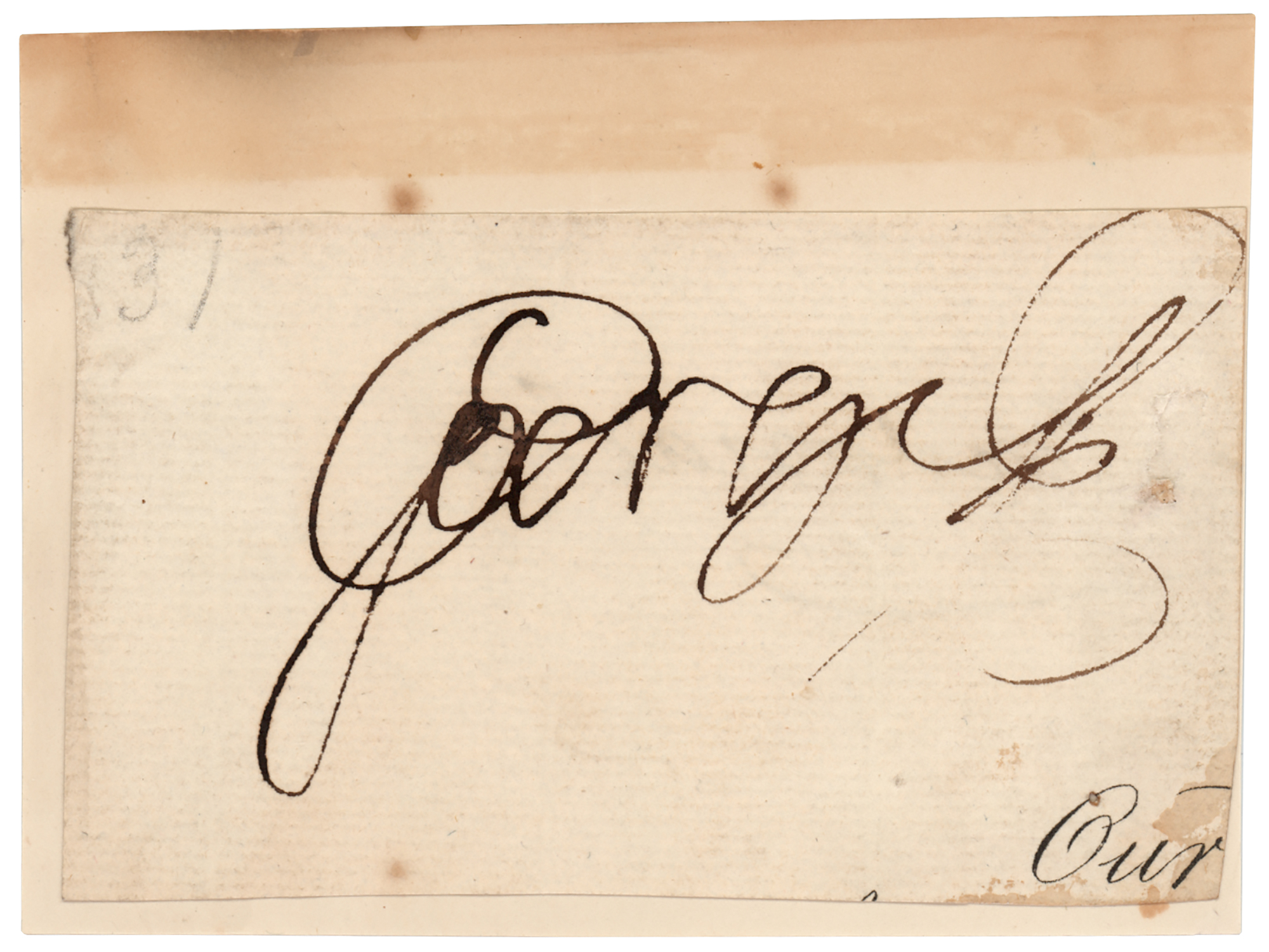 Bold ink signature, "George R,” on an off-white 3.75 x 2.25 slip clipped from the head of a document, affixed to a slightly larger page. In fine condition, with a few small spots of foxing.