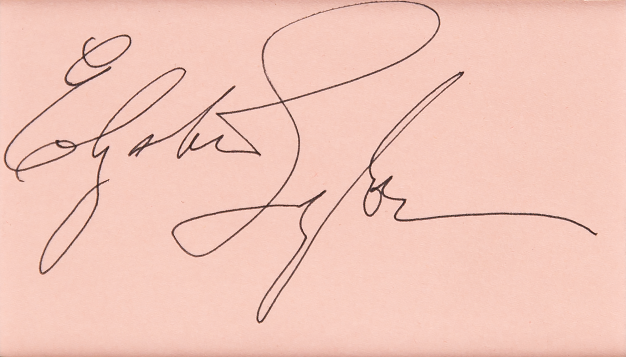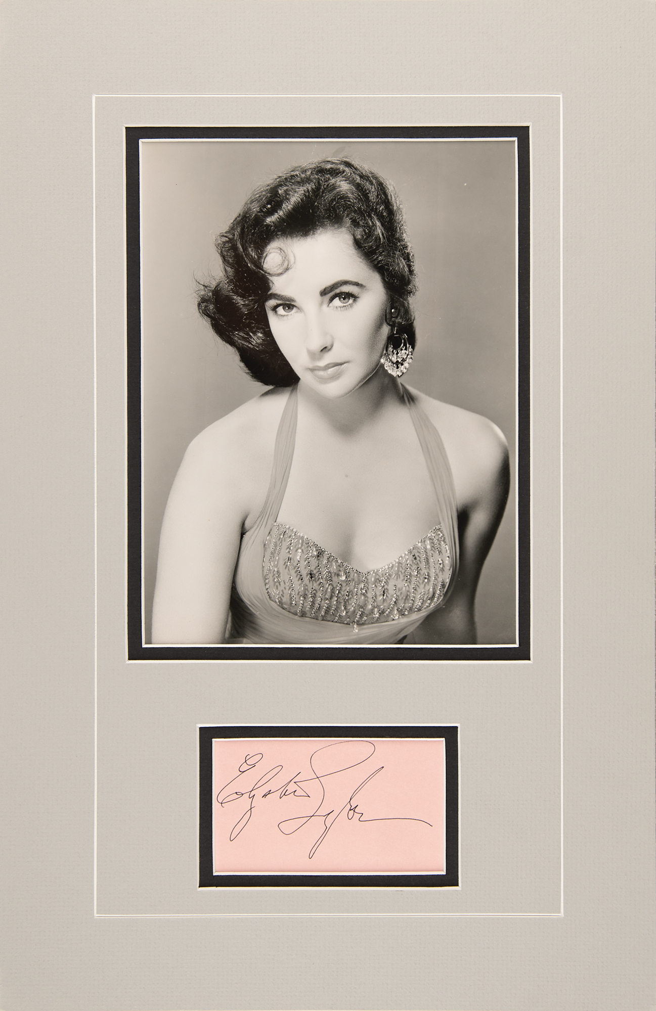 Ink signature, "Elizabeth Taylor,” on a pink 3.75 x 2.25 album page. Double-matted with a portrait photo to an overall size of 11 x 17. In very fine condition.