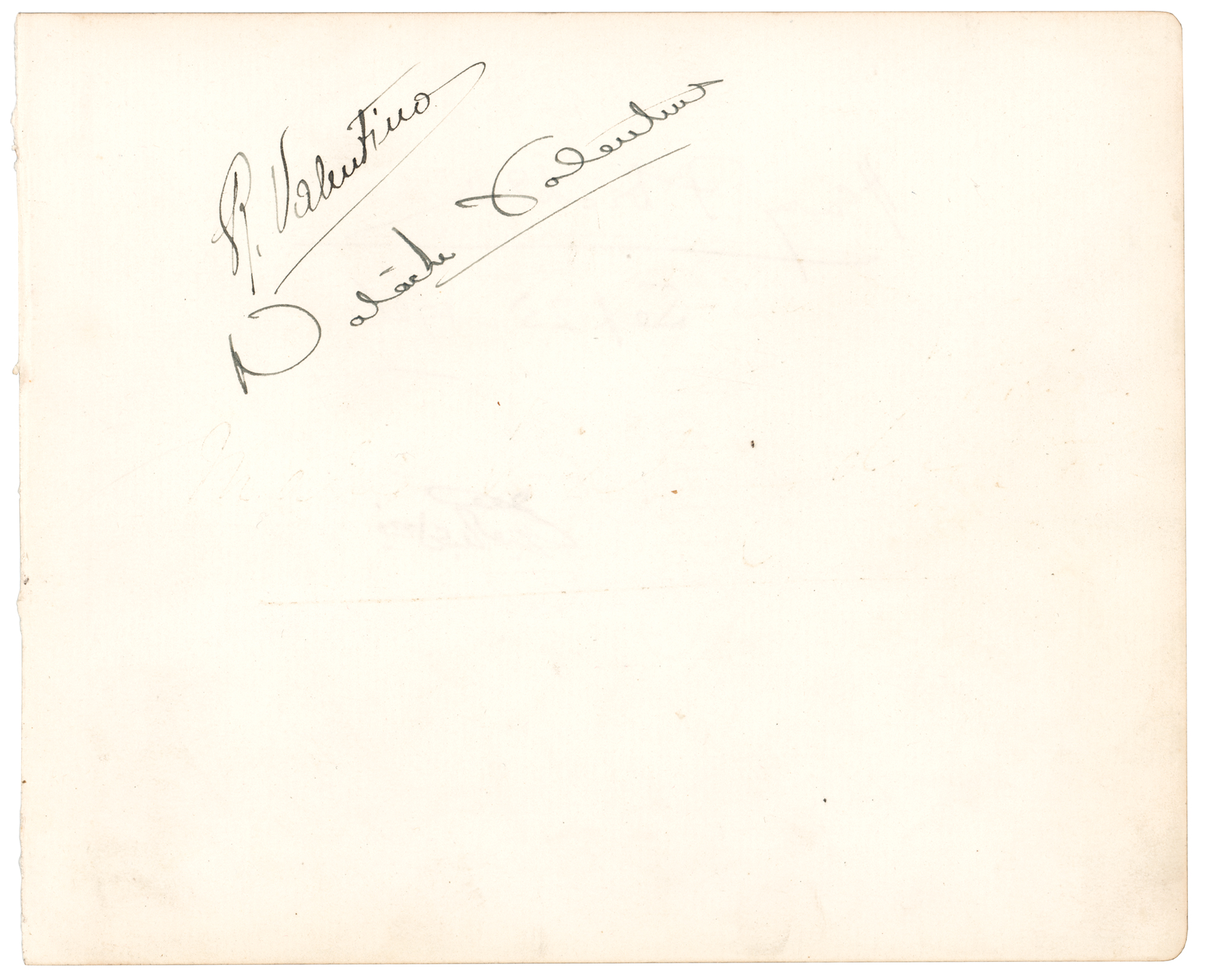 Bold vintage ink signatures, "R. Valentino" and "Natacha Valentino," on an off-white 8 x 6.5 album page. In fine to very fine condition. Accompanied by a modern unsigned photo of the couple.