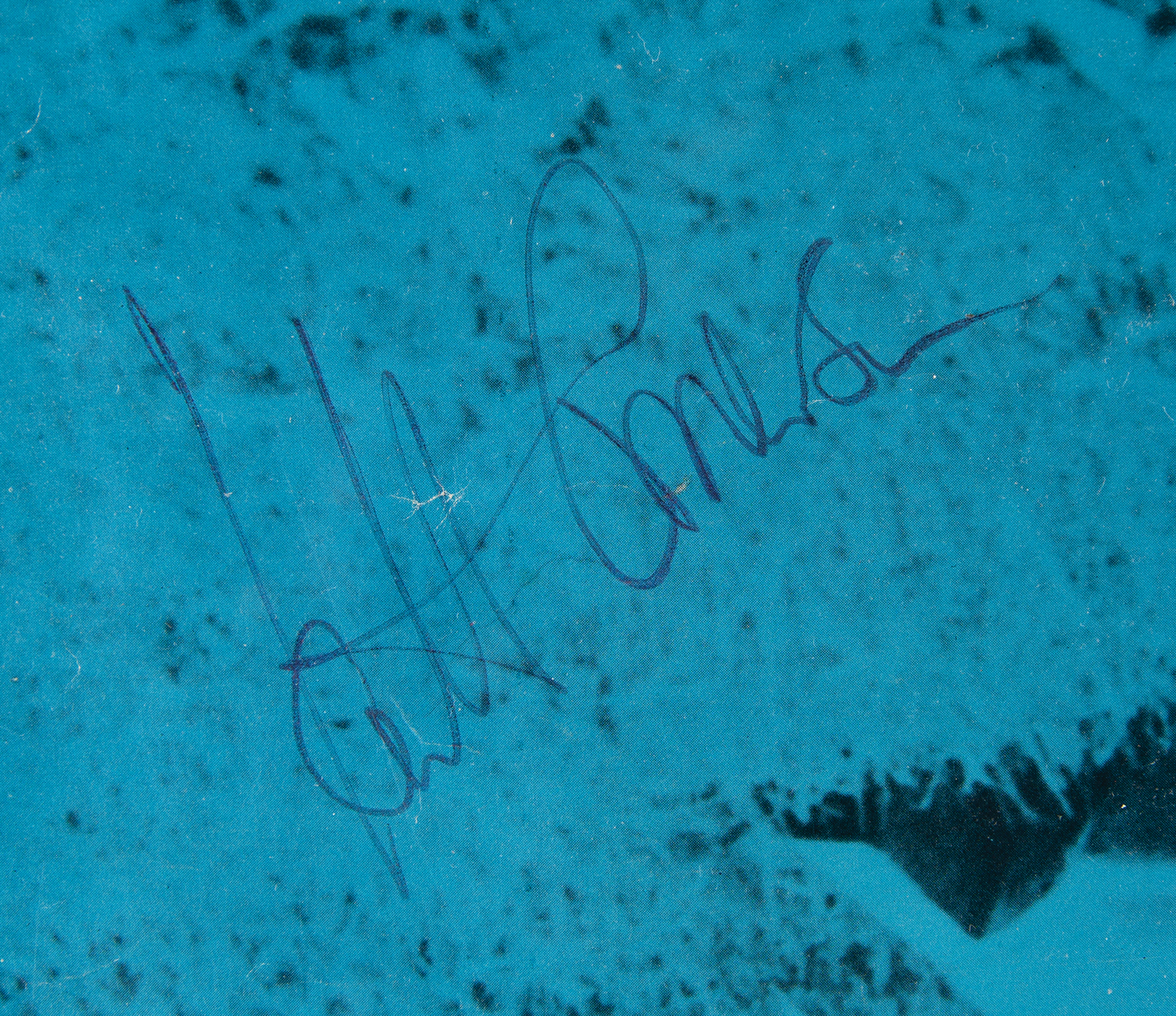 Colorful 24 x 16.75 poster of Emerson, Lake, and Palmer seated on grass, signed in ballpoint by Greg Lake and Carl Palmer, and in felt tip by Keith Emerson. In very good to fine, folded condition, with light creasing, and poor contrast to Palmer's signature.