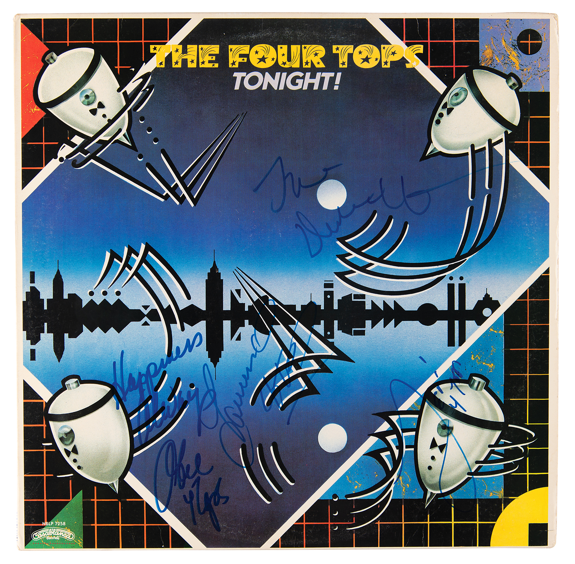 Tonight! album by The Four Tops, signed on the front cover in blue felt tip by Levi Stubbs, Lawrence Payton, Duke Fakir, and Obie Benson. In fine condition. The record is included.