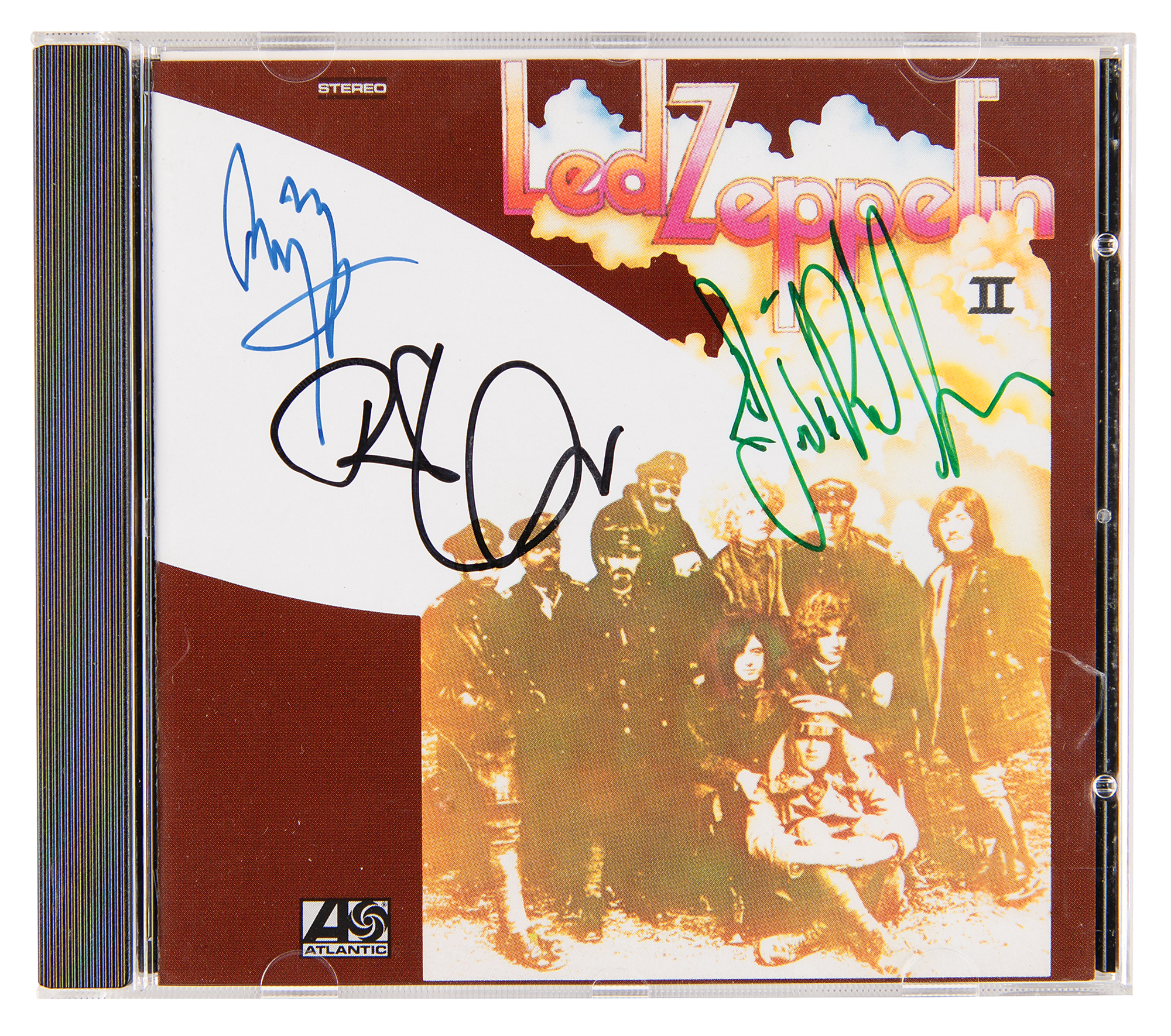 Sought-after Led Zeppelin II CD, signed on the front cover in blue felt tip by Jimmy Page, in black felt tip by Robert Plant, and in green felt tip by John Paul Jones. In fine condition. The CD is included.