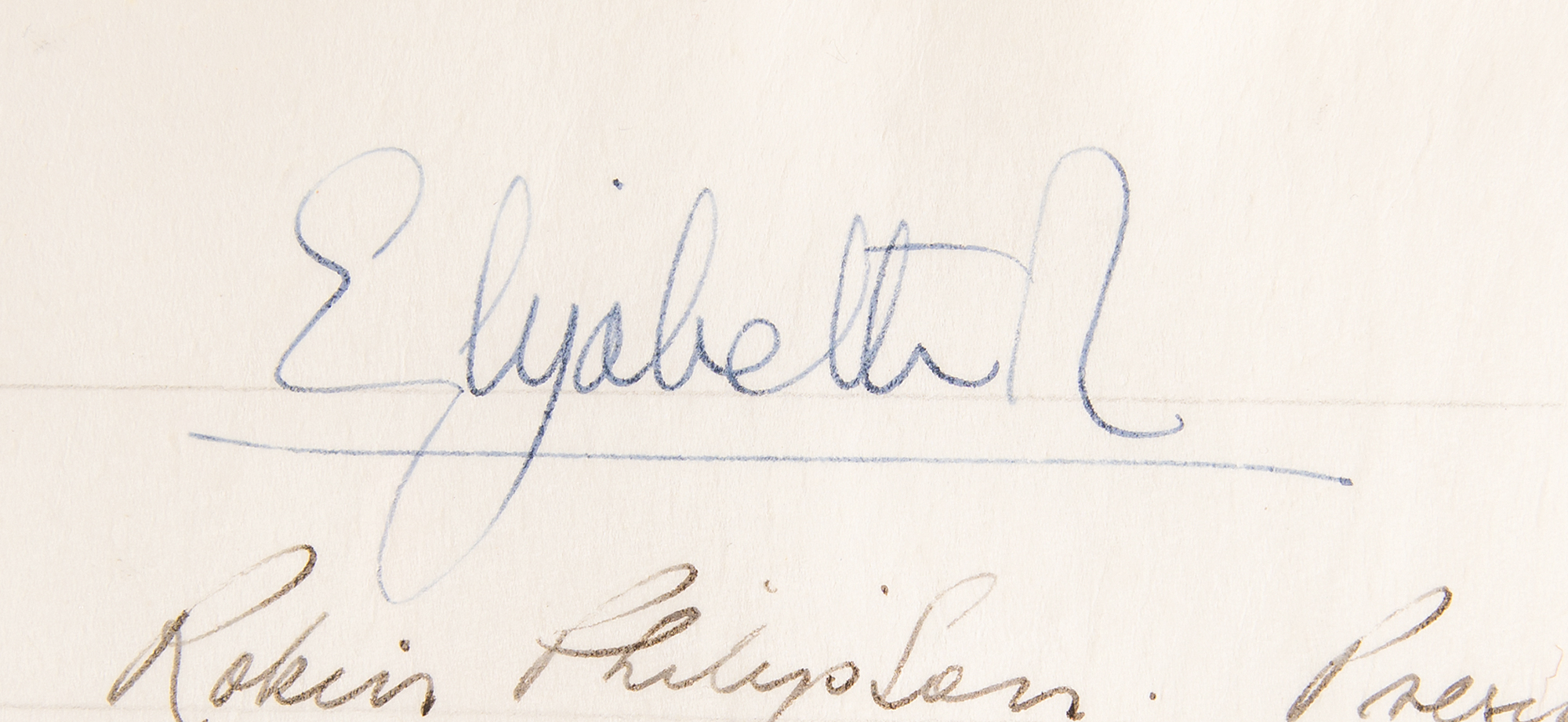 Rare partly-printed vellum DS, signed “Elizabeth R.,” one page, 19.5 x 14.75, December 24, 1974. Diploma from the Royal Scottish Academy of Painting, Sculpture, and Architecture, which approves the election of William Crosbie as an “Academician…in consideration of his eminent talents as a Painter.” Signed prominently at the conclusion by Queen Elizabeth II, and countersigned by academy officials. The document retains its unusual blue ribbon and ‘canister’ seal. In very good to fine condition, with a light stain, and scattered small holes to the top blank area.