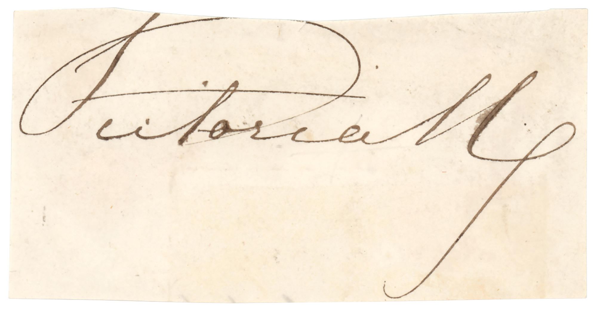 Ink signature of the queen, "Victoria R.,” on an off-white 3.75 x 2 slip. In fine condition, with the closely trimmed top edge affecting the "V" in the signature.