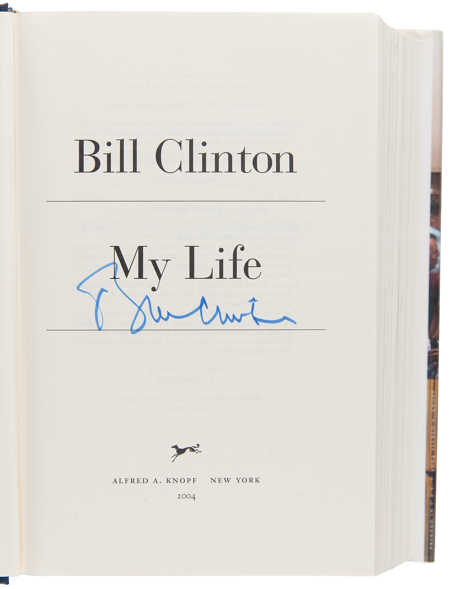 Signed book: My Life. First edition. NY: Alfred A. Knopf, 2004. Hardcover with dust jacket, 6.5 x 9.5, 957 pages. Signed on the title page in blue felt tip by Bill Clinton. In fine condition.