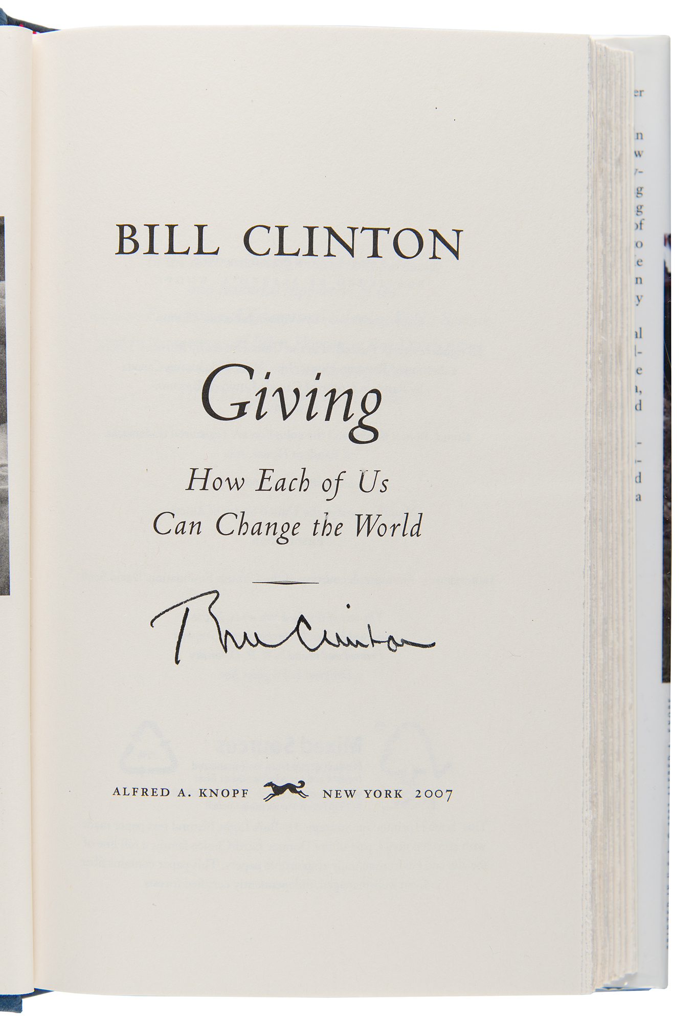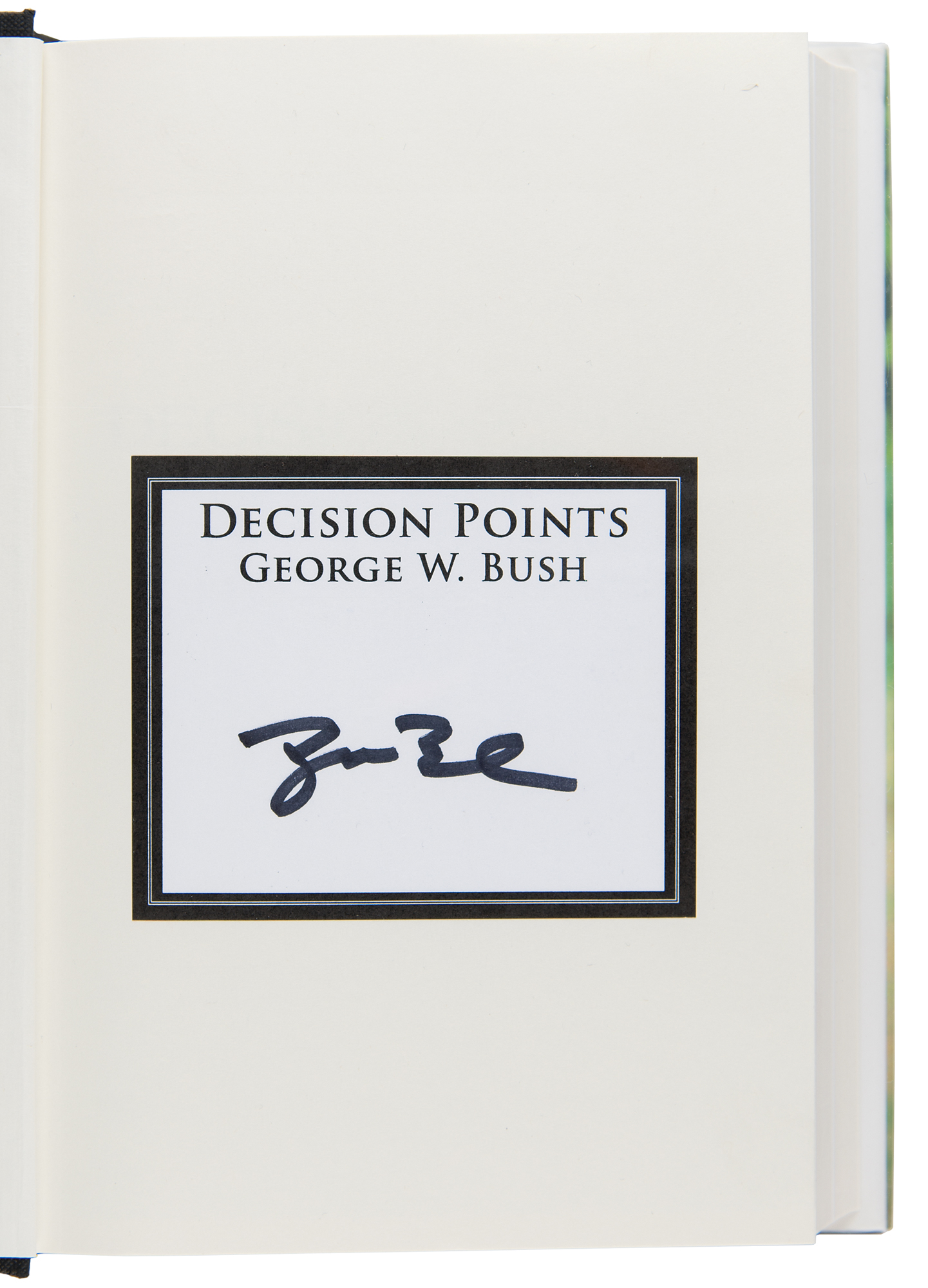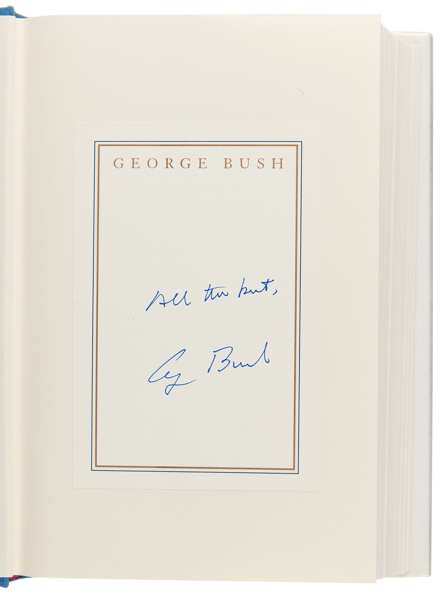 Group of six books, each hardcover with dust jacket, individually signed in ink or felt tip by either George Bush, George W. Bush, Jimmy Carter, Bill Clinton, Gerald Ford, and Richard Nixon. Each former American president either signs on an opening page or on a bookplate affixed to an opening page. Titles include: