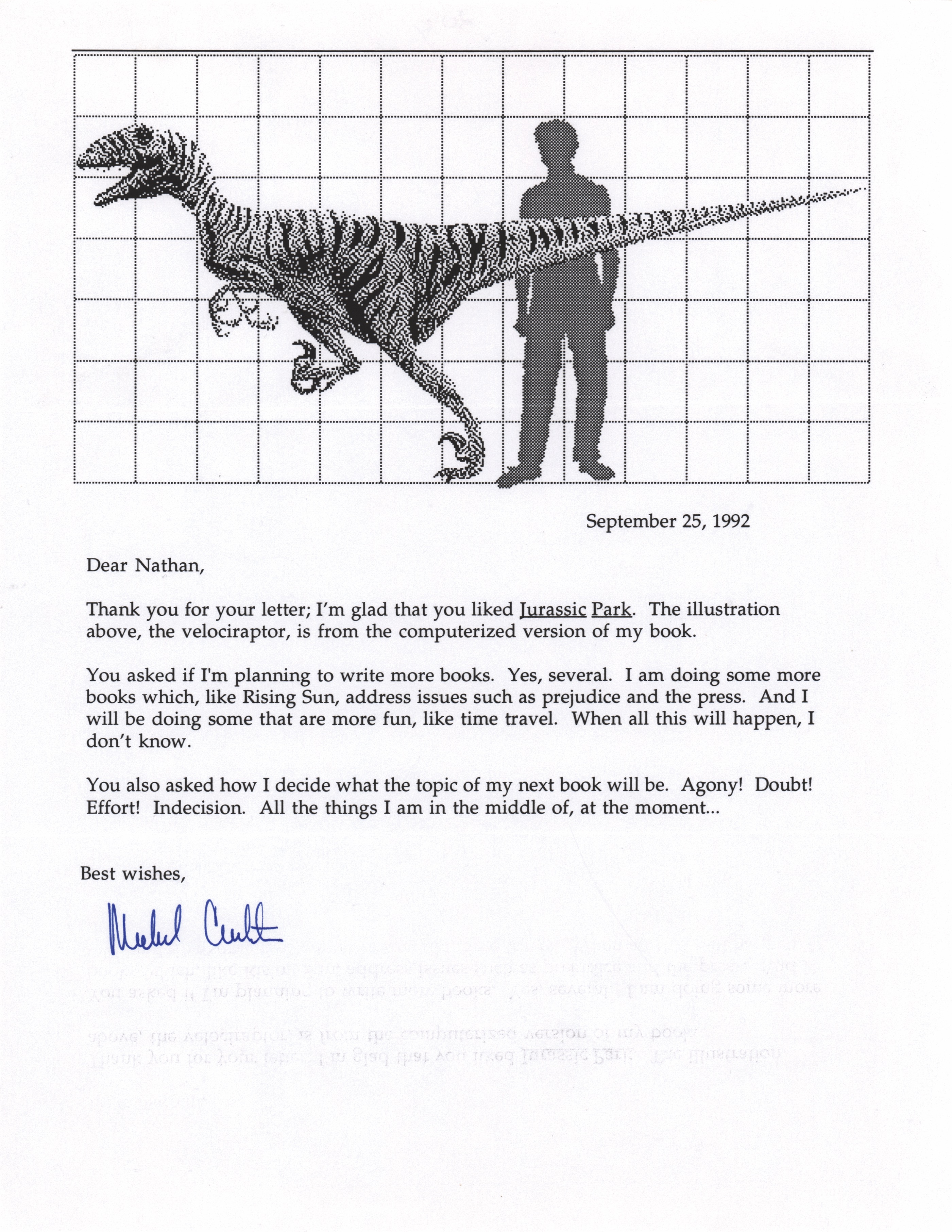 Author, screenwriter, and filmmaker (1942-2008) best known for his science fiction novel Jurassic Park that was later turned into a 1993 film. TLS signed “Michael Critchton,” one page, 8.5 x 11, September 25, 1992. In full, "Thank you for your letter; I'm glad that you liked Jurassic Park. The illustration above, the velociraptor, is from the computerized version of my book. You asked if I'm planning to write more books. Yes, several. I am doing some more books which, like Rising Sun, address issues such as prejudice and the press. And I will be doing some that are more fun, like time travel. When all this will happen, I don't know. You also asked how I decide what the topic of my next book will be. Agony! Doubt! Effort! Indecision. All the things I am in the middle of, at the moment…" In fine condition.