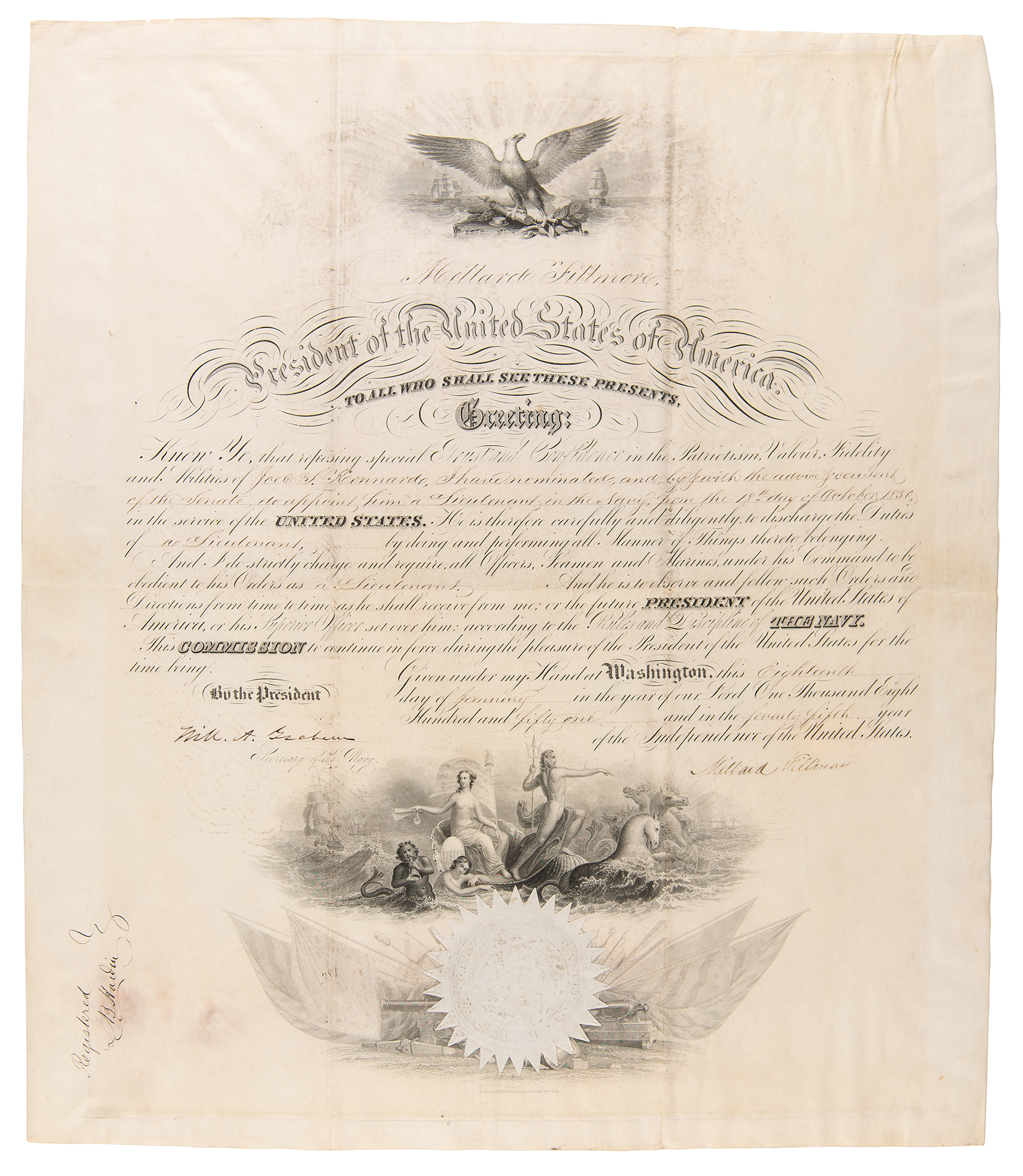 Partly-printed vellum DS as president, one page, 16 x 18.5, January 18, 1851. President Fillmore appoints Joel S. Kennard “as a Lieutenant in the Navy…in the service of the United States." Signed at the conclusion by Millard Fillmore and countersigned by Secretary of the Navy William A. Graham. The beige Navy Department seal remains affixed to the lower vignette. In fine condition.