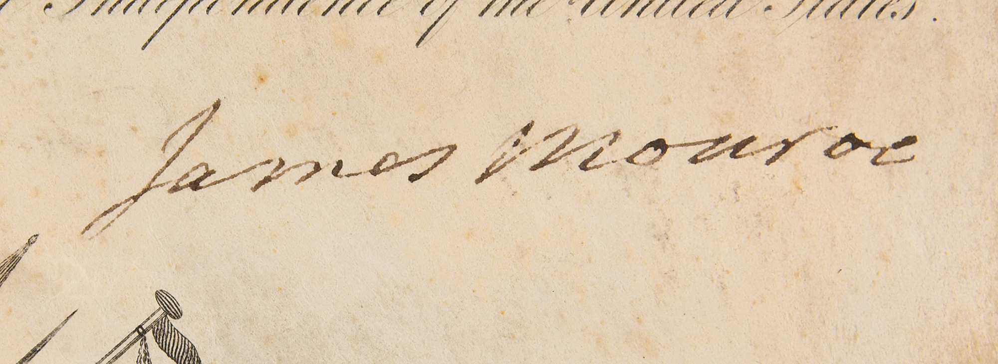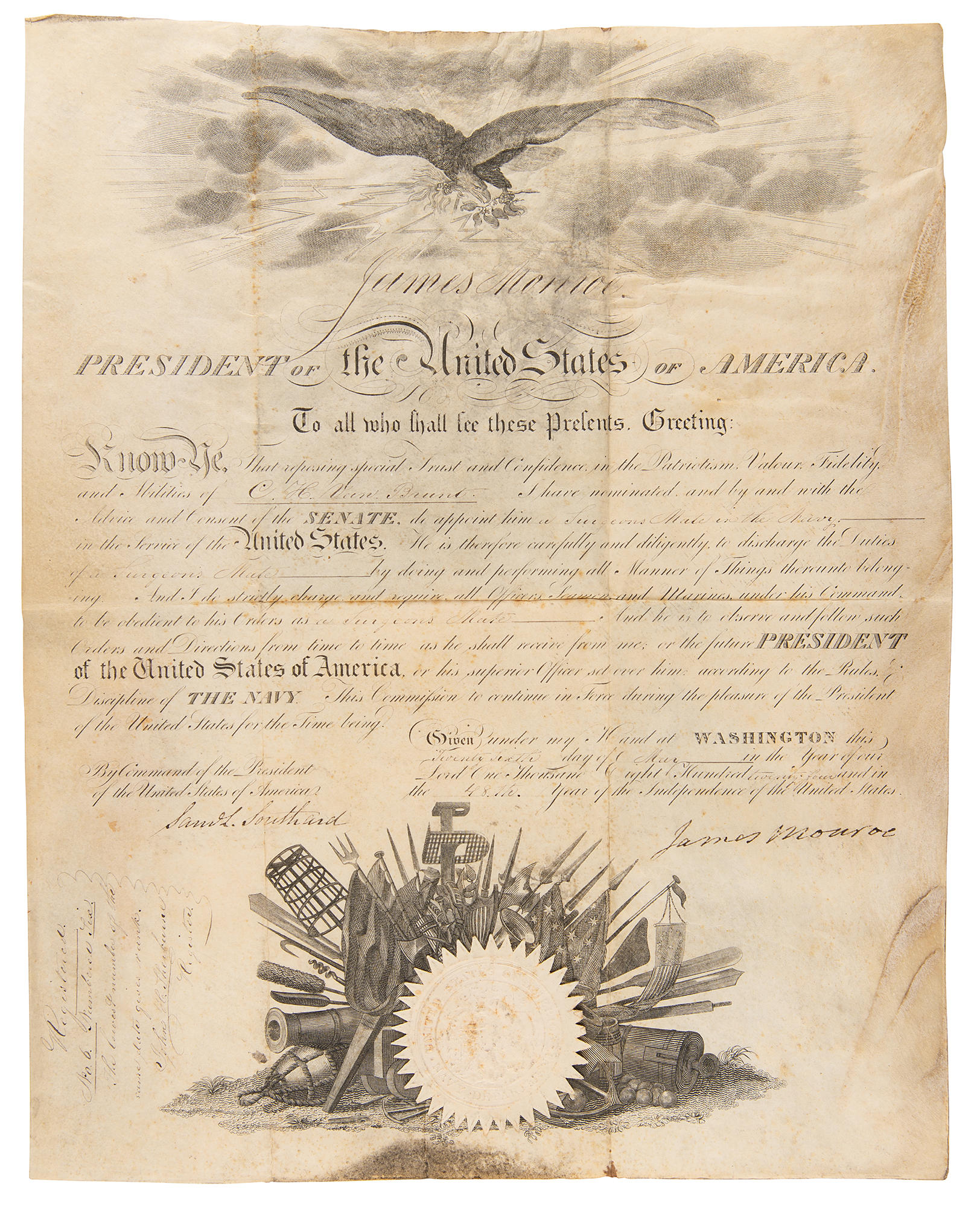 Partly-printed vellum DS as president, one page, 13.75 x 17, May 26, 1824. President Monroe appoints C. H. Van Brunt as a “Surgeon’s Mate in the Navy, in the service of the United States.” Signed crisply at the conclusion by James Monroe and countersigned by Secretary of the Navy Samuel L. Southard. The beige Navy Department seal remains affixed to the lower vignette. In very good to fine condition, with overall light soiling and light toning.