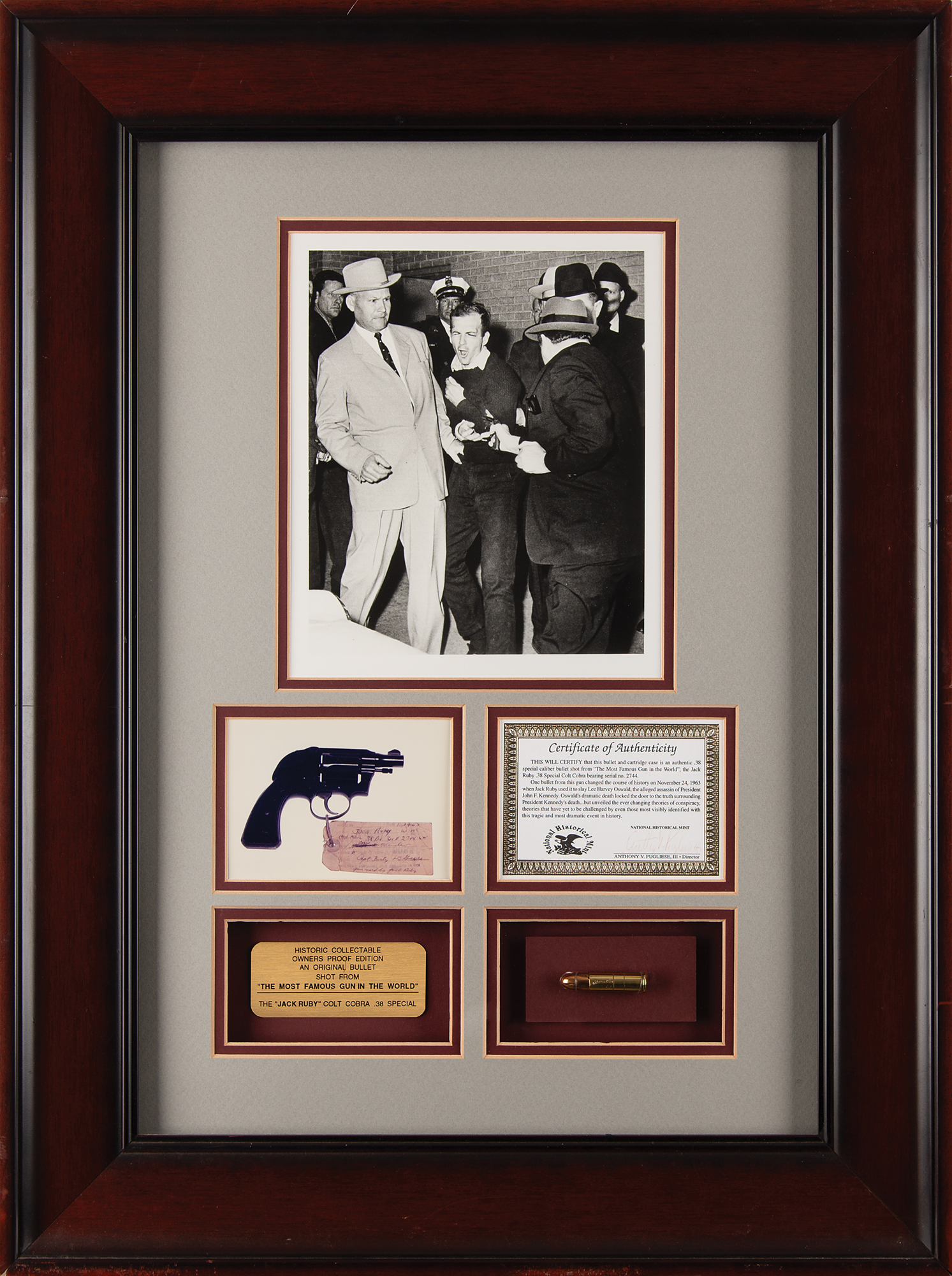 A bullet shot by the actual .38 caliber Colt Cobra revolver, Serial #2744 LW, used by Jack Ruby to shoot Lee Harvey Oswald on November 24, 1963, in the basement at Dallas Police Headquarters, along with its spent cartridge case. The bullet and casing, identified as part of the 'Owner's Proof Edition,' are mounted in a display with an engraved plaque, photograph, and certificate of authenticity from Anthony V. Pugliese III of the National Historical Mint. Framed to an overall size of 19 x 25. In fine condition.