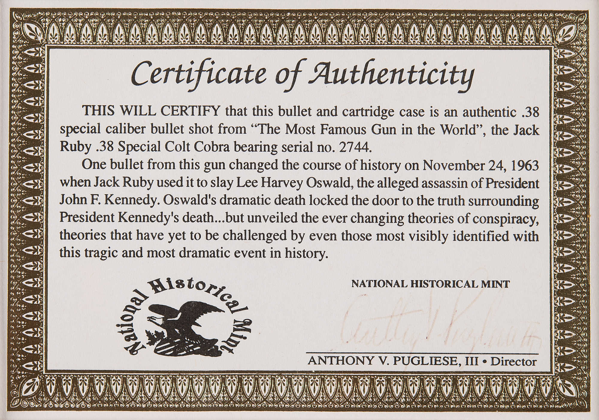 The certificate reads: "This will certify that this bullet and cartridge case is an authentic .38 special caliber bullet shot from 'The Most Famous Gun in the World,' the Jack Ruby .38 Special Colt Cobra bearing serial no. 2744. One bullet from this gun changed the course of history on November 24, 1963 when Jack Ruby used it to slay Lee Harvey Oswald, the alleged assassin of President John F. Kennedy. Oswald's dramatic death locked the door to the truth surrounding President Kennedy's death…but unveiled the ever changing theories of conspiracy, theories that have yet to be challenged by even those most visibly identified with this tragic and most dramatic event in history."