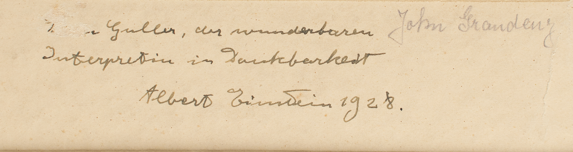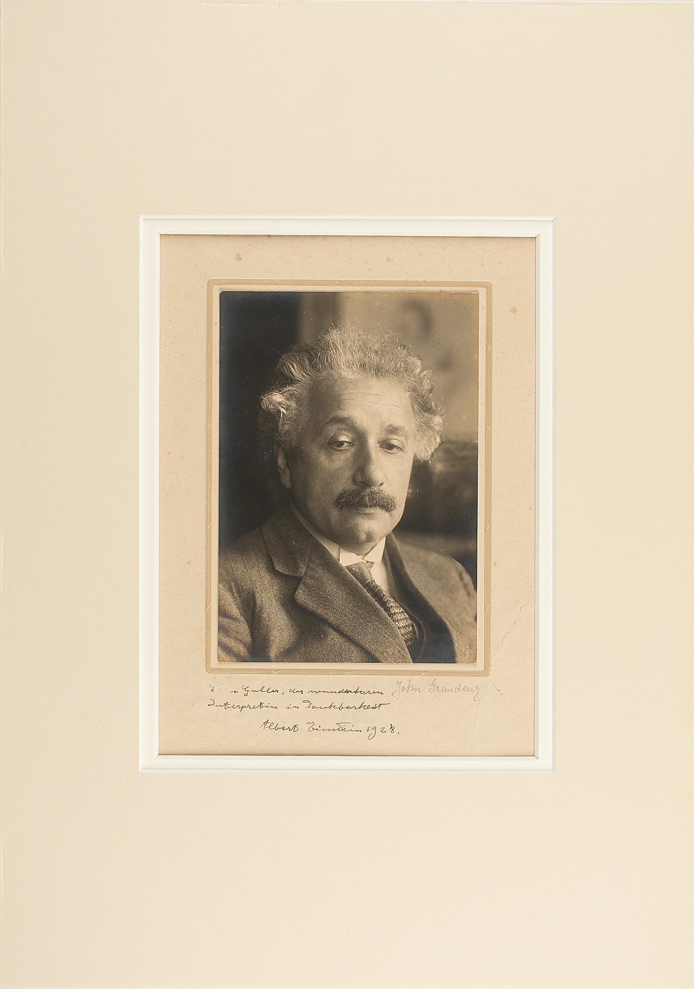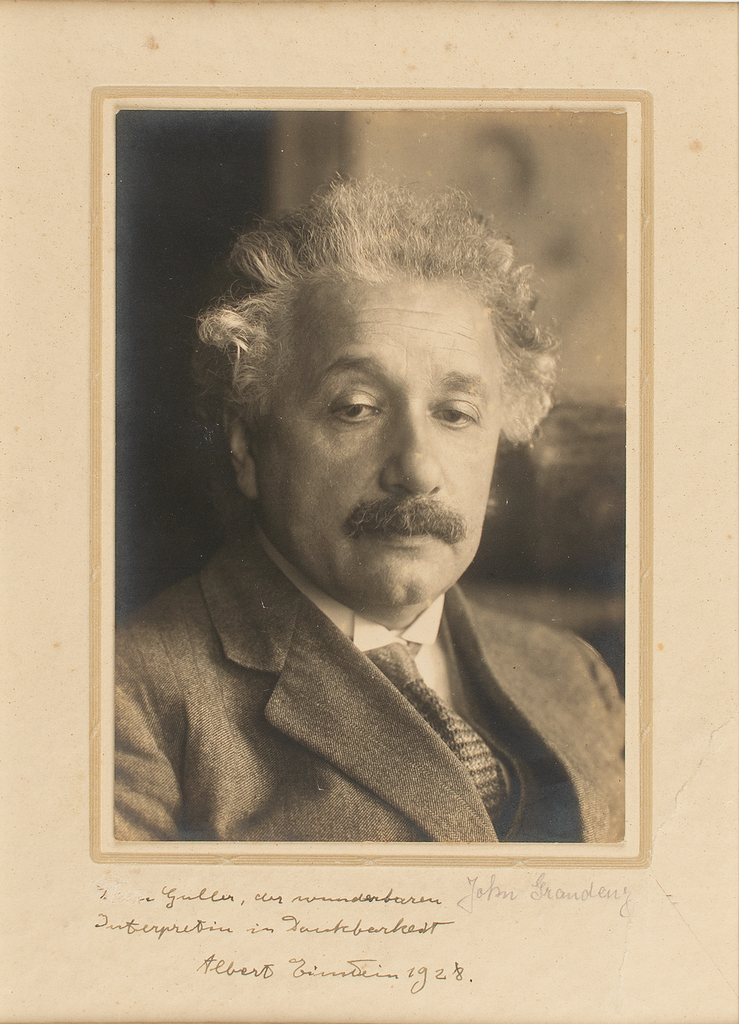 Scarce vintage 4 x 5.75 silver gelatin portrait of Einstein by German press photographer John Graudenz, affixed to the original studio mount, which is signed and inscribed in German in fountain pen, "[To Youra] Guller, the wonderful performer, in gratitude, Albert Einstein, 1928." The mount is also signed by Graudenz. Double-matted to an overall size of 11 x 15.75. In very good to fine condition, with a few spots of foxing to the mount, a crack to the lower right corner of the mount, and a surface abrasion to the recipient's first name.