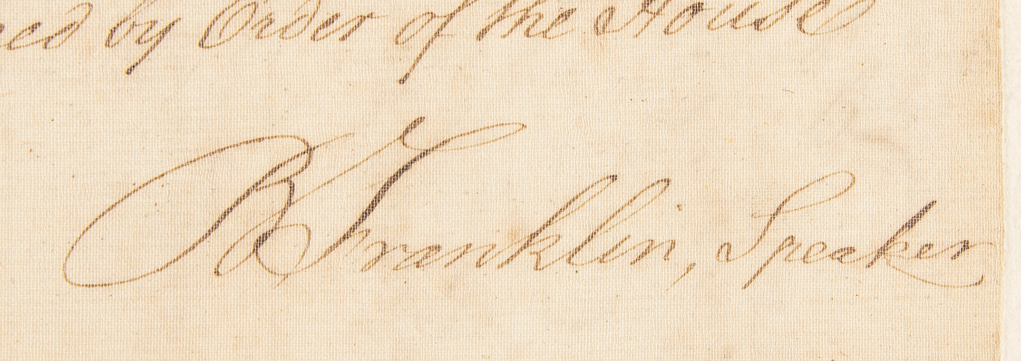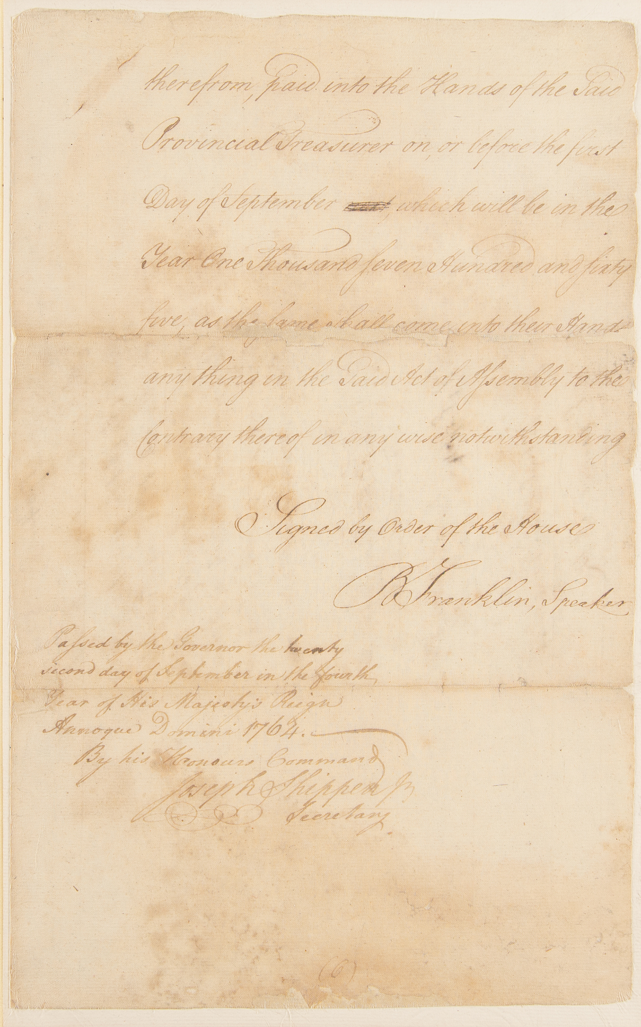 Manuscript DS, signed "Signed by the Order of the House, B. Franklin, Speaker," six pages, 7.5 x 12.5, September 22, 1764. A supplement to the act entitled "An Act for granting to His Majesty the Sum of Twenty Four Thousand pounds for the Defense and Protection of this province and for other purposes herein mentioned," which is signed neatly at the conclusion by Benjamin Franklin as Speaker of the Pennsylvania Assembly, and countersigned on the first page by John Penn as Governor of the Province of Pennsylvania.