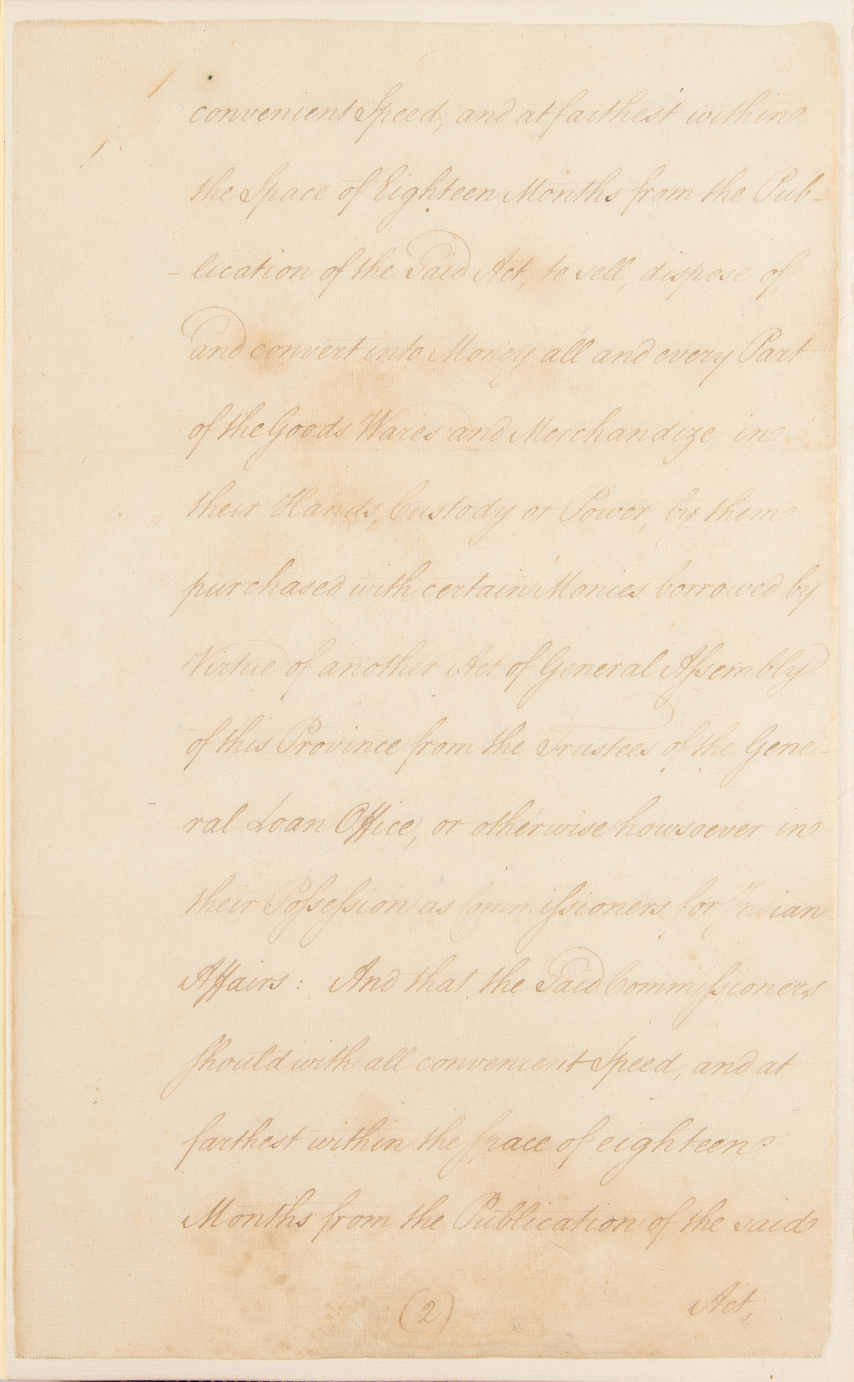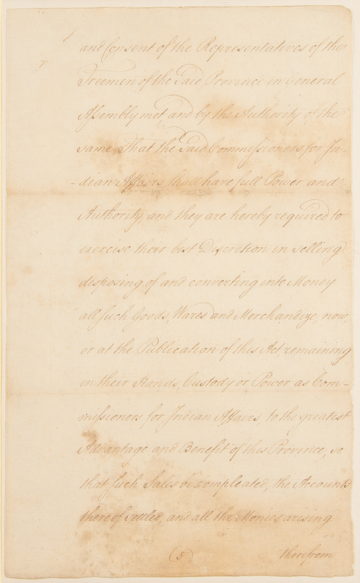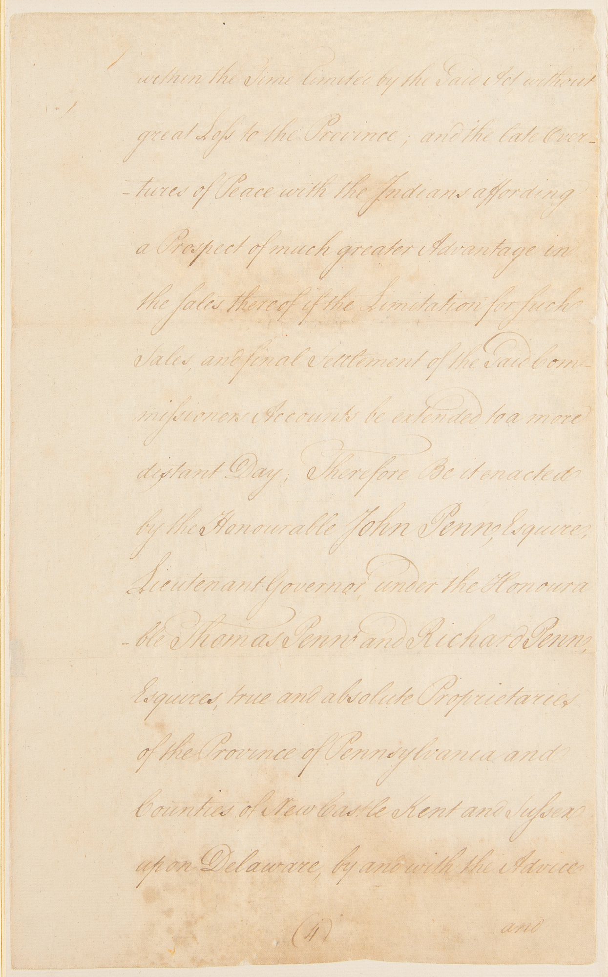 The document reads, in part: "Whereas by an Act of Assembly passed in the third year of His Majesty's reign [entitled above]…the Commissioners for Indian Affairs are enjoined and required with all convenient Speed, and at farthest within the Space of Eighteen Months from the Publication of the Said Act, to sell, dispose of, and convert into Money all and every Part of the Goods, Wares and Merchandize in their Hands, Custody or Power, by them purchased with certain Monies borrowed by Virtue of another Act of General Assembly of this Province from the Trustees of the General Loan Office, or otherwise howsoever in their Possession as Commissioners for Indian Affairs: And that the Said Commissioners should with all convenient Speed, and at farthest within the Grace of eighteen Months from the Publication of the said Act, pay into the Hands of the Provincial Treasurer all Such Monies as Should arise from the Sale of the Said Goods, Wares and Merchandize, together with all such other Money as should be in their Hands belonging to the Said Indian Trade by any Ways or Means whatsoever, upon a full and final settlement of their Accounts; which the Said Commissioners were required to render and settle with the Committee of Assembly annually appointed for the Adjustment of the public Accounts: But inasmuch as there is yet remaining at Fort Pitt a large Quantity of the said Goods, which probably cannot be sold and converted into Money within the Time limited by the Said Act without great Loss to the Province; and the late Overtures of Peace with the Indians affording a Prospect of much greater Advantage in the Sales thereof if the Limitation for such Sales, and final Settlement of the said Commissioners Accounts be extended to a more distant Day; Therefore Be it enacted by the Honourable John Penn, Esquire, Lieutenant Governor under the Honourable Thomas Penn and Richard Penn, Esquires, true and absolute Proprietaries of the Province of Pennsylvania and Counties of New Castle, Kent, and Sussex upon Delaware, by and with the Advice and Consent of the Representatives of the Freemen of the Said Province in General Assembly met, and by the Authority of the same That the Said Commissioners for Indian Affairs shall have full Power and Authority, and they are hereby required to exercise their best Discretion in selling, disposing of and converting into Money all Such Goods, Wares and Merchandize, now, or at the Publication of this Act, remaining in their Hands, Custody or Power as Commissioners for Indian Affairs, to the greatest Advantage and Benefit of this Province, so that Such Sales be completed, the Accounts thereof settled, and all the Monies arising therefrom, paid into the Hands of the Said Provincial Treasurer on, or before the first Day of September, which will be in the Year One Thousand Seven Hundred and Sixty five, as the same shall all come into their Hands anything in the Said Act of Assembly to the Contrary thereof in any wise notwithstanding." The document has been professionally affixed inside a custom-made leather-bound presentation folder, which also contains the document's original embossed seal with faded red ribbon. In very good to fine condition, with light staining, professional repairs to small areas of paper loss, and expert silking to reinforce both sides of each page. Accompanied by a full letter of authenticity from PSA/DNA.