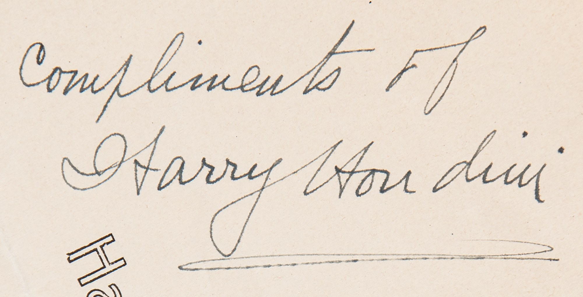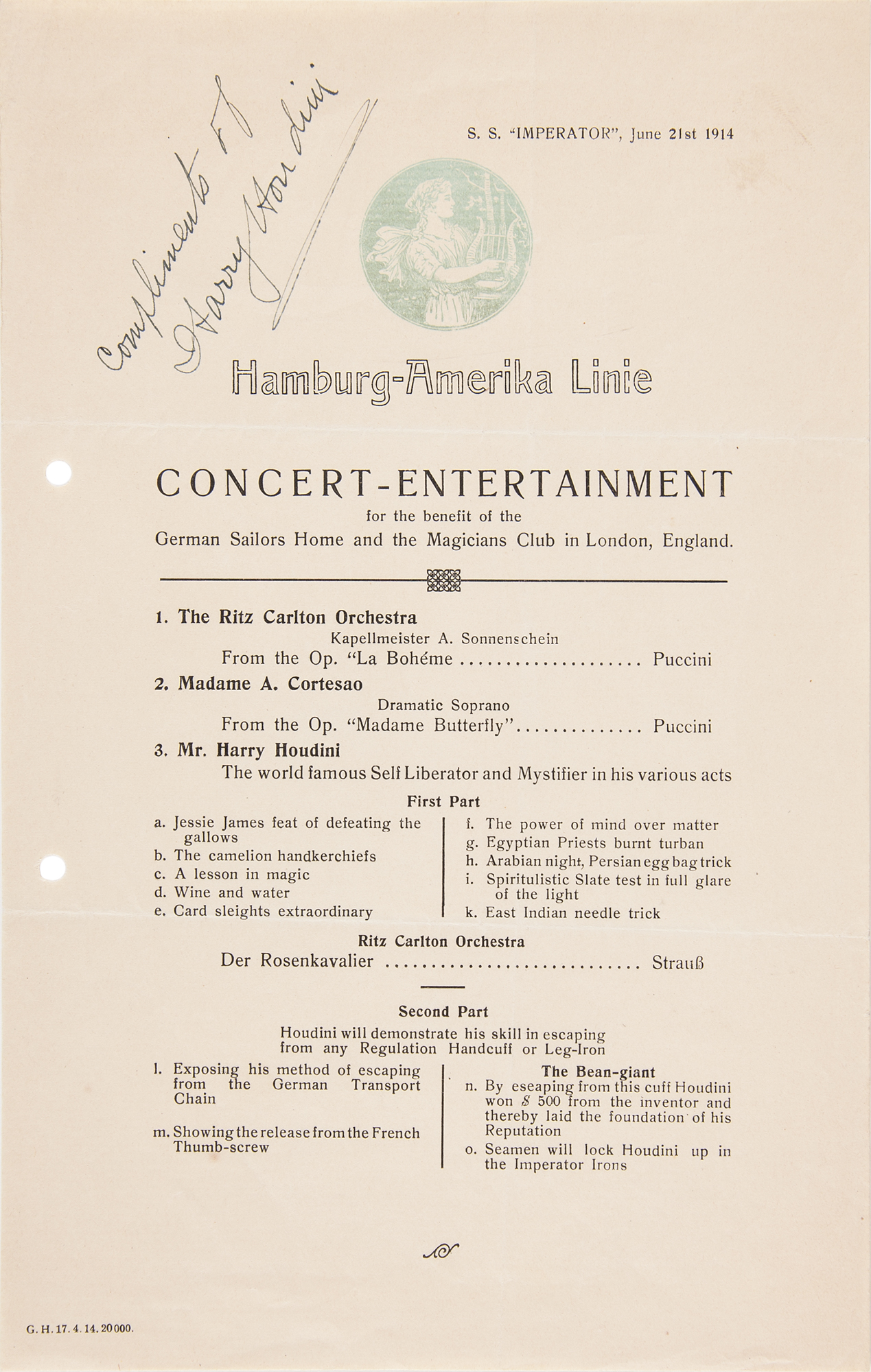 Terrific original program sheet for “Concert-Entertainment” aboard the SS Imperator, a massive German ocean liner built for the Hamburg America Line, one page, 7 x 11, dated June 21, 1914, signed in black ink, “Compliments of Harry Houdini.” The concert, held “for the benefit of the German Sailors Home and the Magicians Club in London, England,” lists performances by the Ritz Carlton Orchestra, Madame A. Cortesao, and “Mr. Harry Houdini, The world famous Self Liberator and Mystifier in his various acts." Houdini’s performance is listed in two parts with a total of 15 acts. The first part includes tricks like “Jessie James feat of defeating the gallows,” “The camelion handkerchiefs,” “Wine and water,” “Card sleights extraordinary,” “Spiritualistic Slate test in full glare of the light,” and “East Indian needle trick.” The second part consists of four tricks where “Houdini will demonstrate his skill in escaping from any Regulation Handcuff or Leg-Iron.” In fine condition, with two file holes to the left edge.