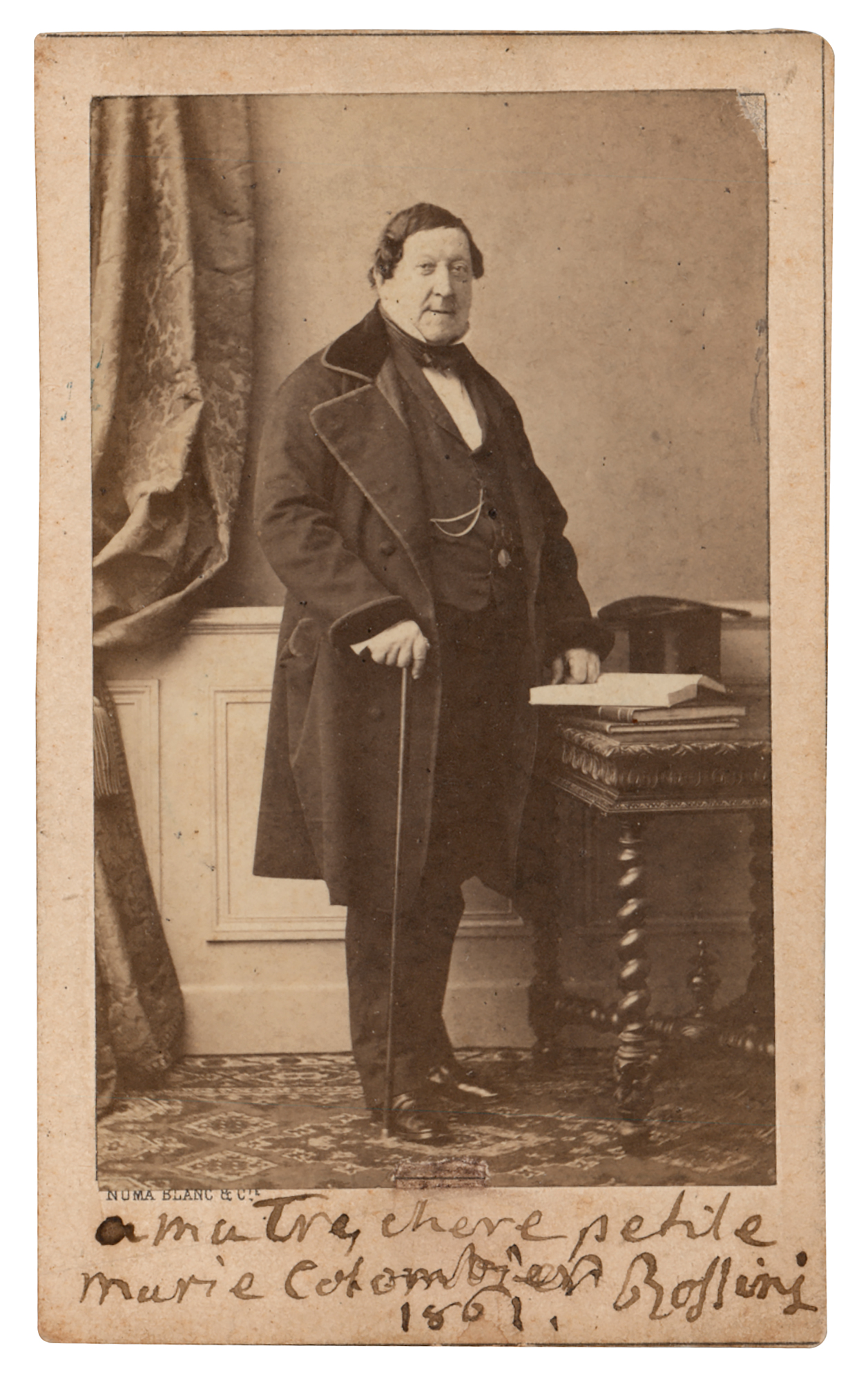 Important Italian composer (1792-1868) who became one of the seminal figures in the history of opera with such repertoire staples as The Barber of Seville and William Tell. Scarce 2.5 x 4 carte-de-visite photo of the great composer standing in a full-length pose by Numa Blanc & Cie., Paris, signed and inscribed on the mount in ink, "A matre, chere petite Marie Colombier, Rossini, 1861." In fine condition.