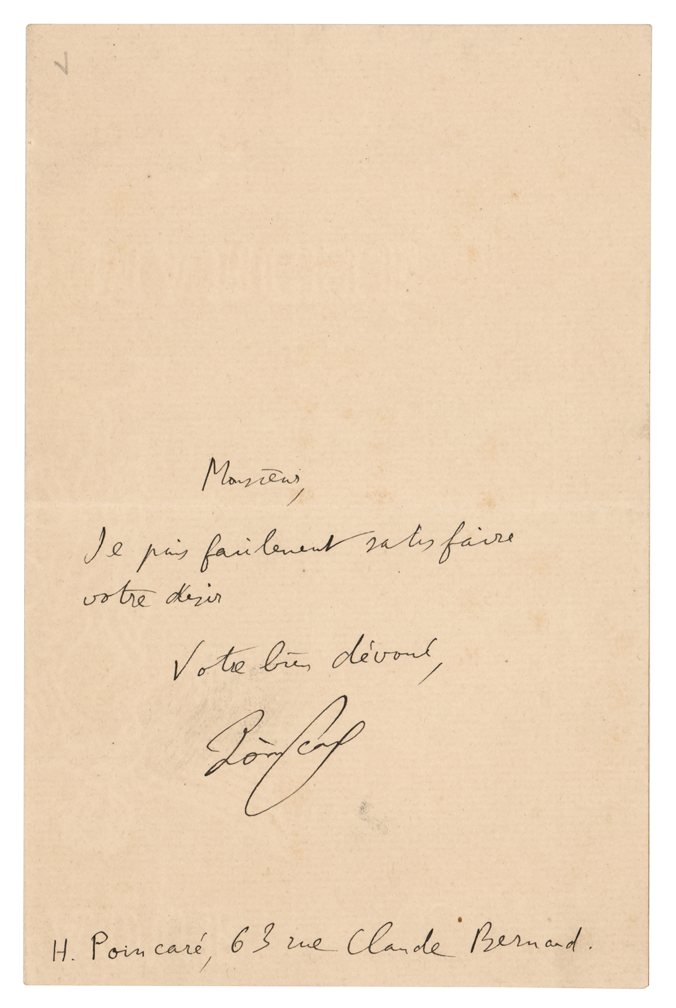 French mathematician, physicist, and philosopher of science (1854-1912) who famously formulated the 'Poincare Conjecture,' which went unsolved for nearly a century. ALS in French, signed “Poincare,” one page, 4.5 x 7, no date. Brief untranslated handwritten letter to a gentleman. In fine condition.