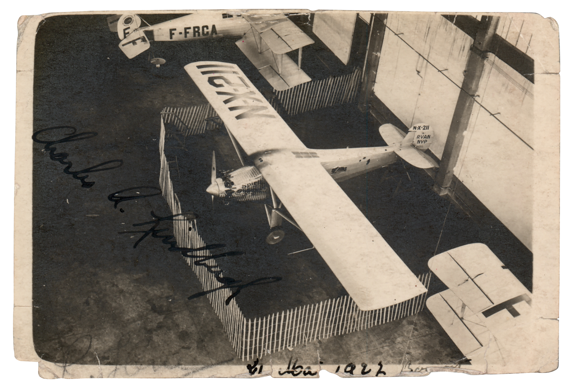 Vintage matte-finish 4.25 x 3 candid photo of the Spirit of St. Louis (registration: N-X-211) in its hangar, seen from above, nicely signed in fountain pen, "Charles A. Lindbergh." Dated in another hand with the day he arrived in Paris, "21 Mai 1927," having successfully completed the first nonstop solo transatlantic flight. In very good to fine condition, with moderate signature contrast, and trimming and wear to the edges.