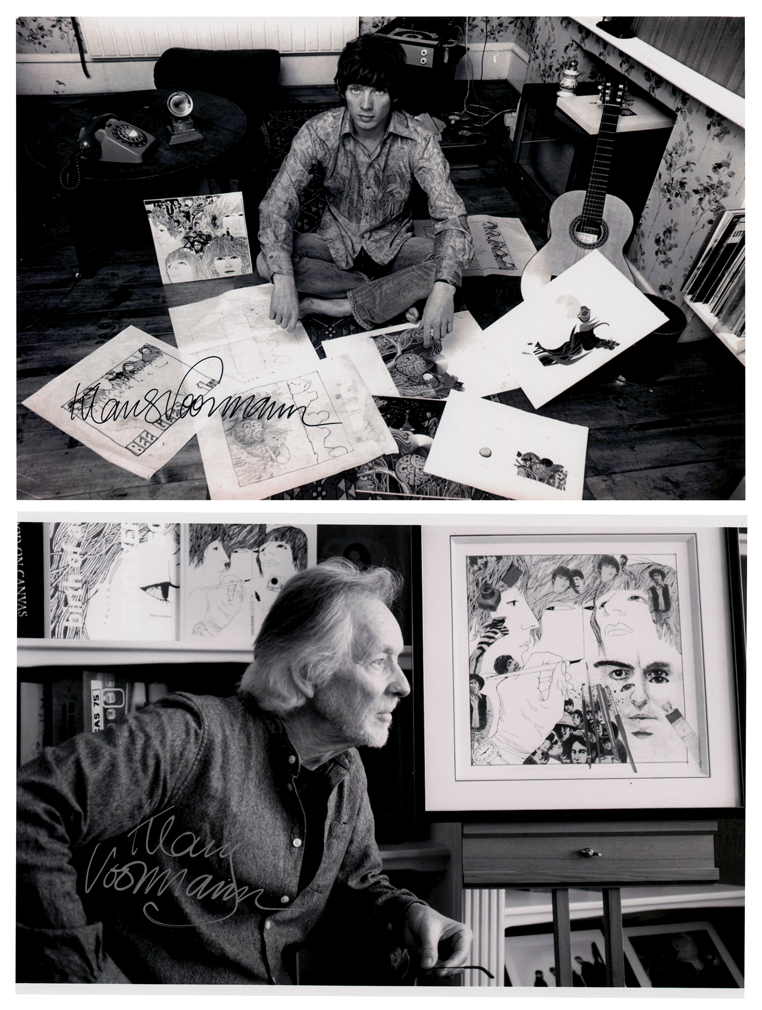 Two different glossy 12 x 8 photos of the artist who designed the Beatles' Revolver album cover, each signed in ink by Klaus Voormann. In very fine condition.