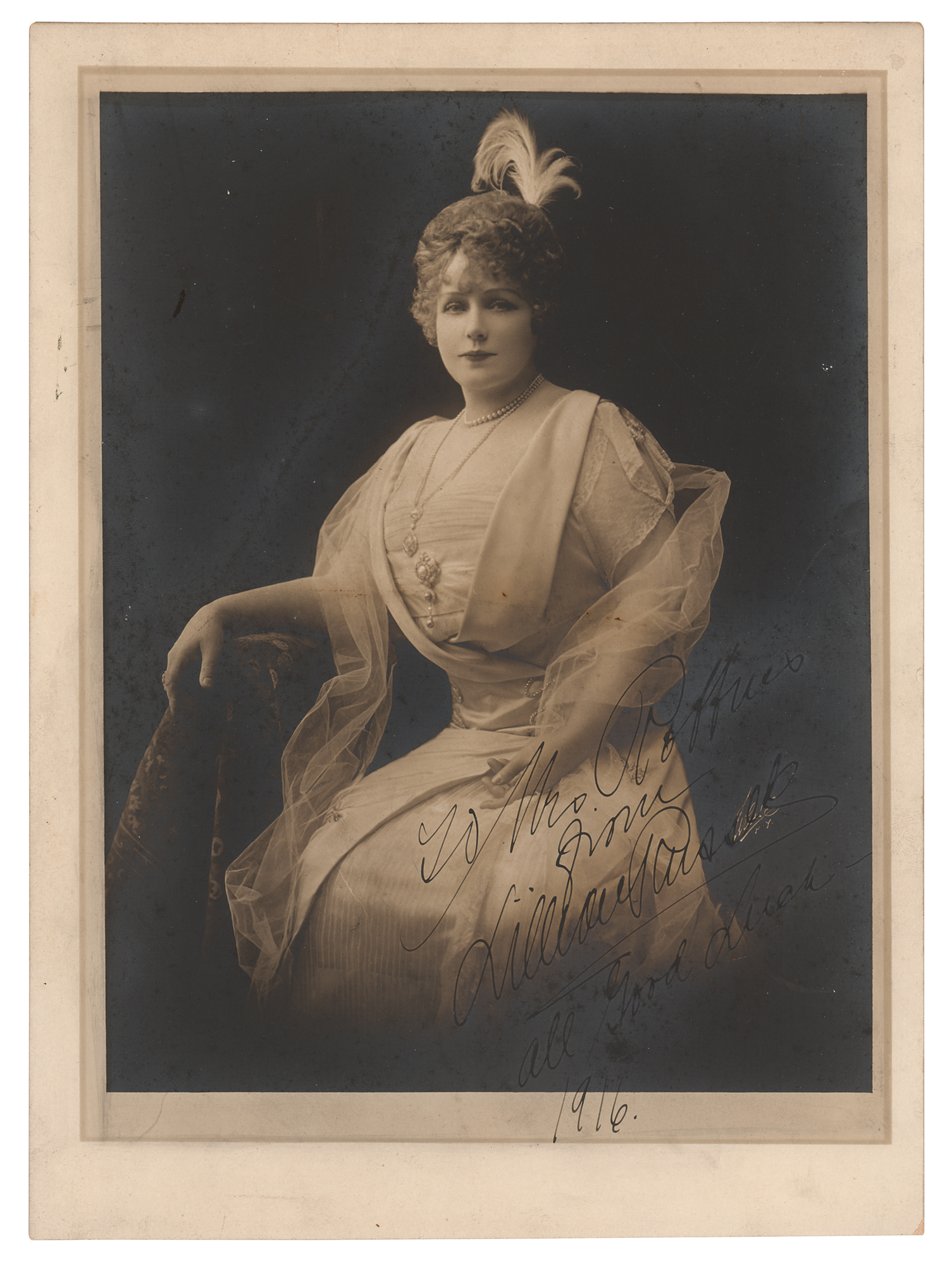 Singer, actress, and flamboyant beauty of the Gay Nineties (1861-1922). Vintage matte-finish 8 x 11 photo of the popular early actress and singer in a beautiful three-quarter-length pose, neatly signed and inscribed in ink, "To Mrs. Roffies, from Lillian Russell, All Good Luck, 1916.” In very good to fine condition, with irregular overall silvering.