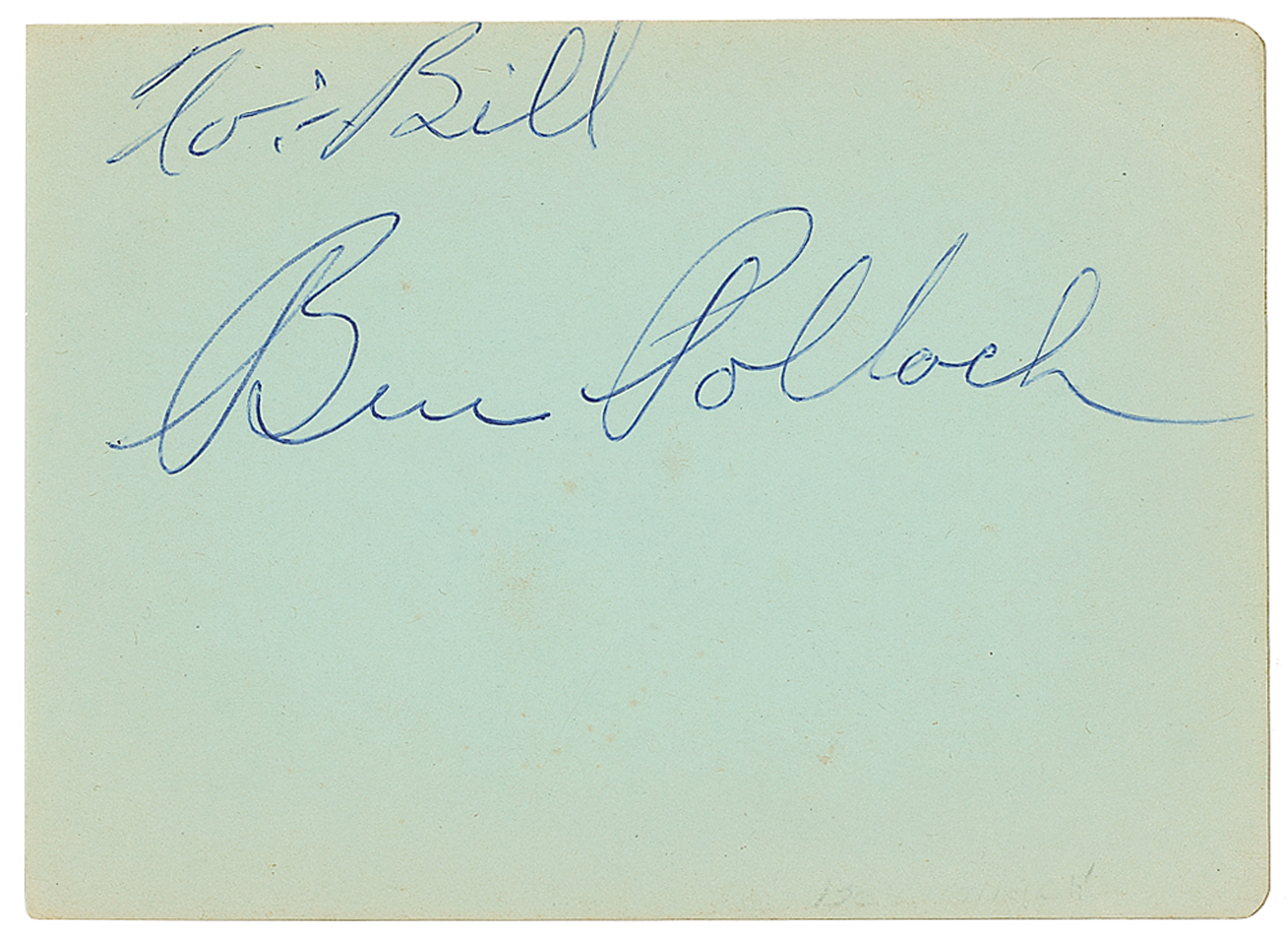 Drummer and bandleader (1903–1971) known as the 'Father of Swing,' who discovered or employed such greats as Benny Goodman, Jack Teagarden, Glenn Miller, Jimmy McPartland, and Harry James. Vintage ballpoint signature and inscription, "To: Bill, Ben Pollack," on a light green 5.25 x 3.75 album page. In fine condition, with some mild edge toning, and a crease to the top right corner.