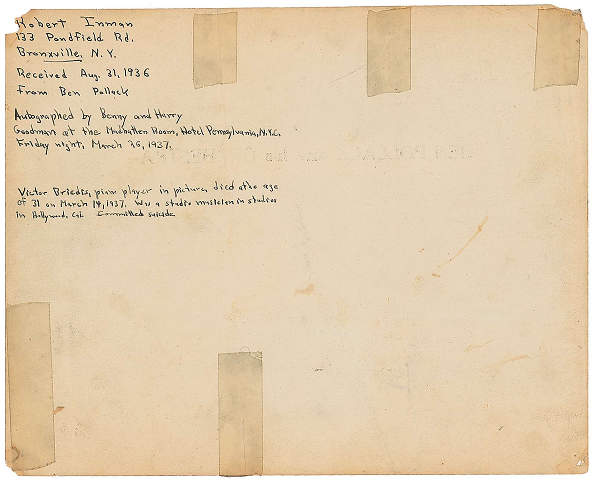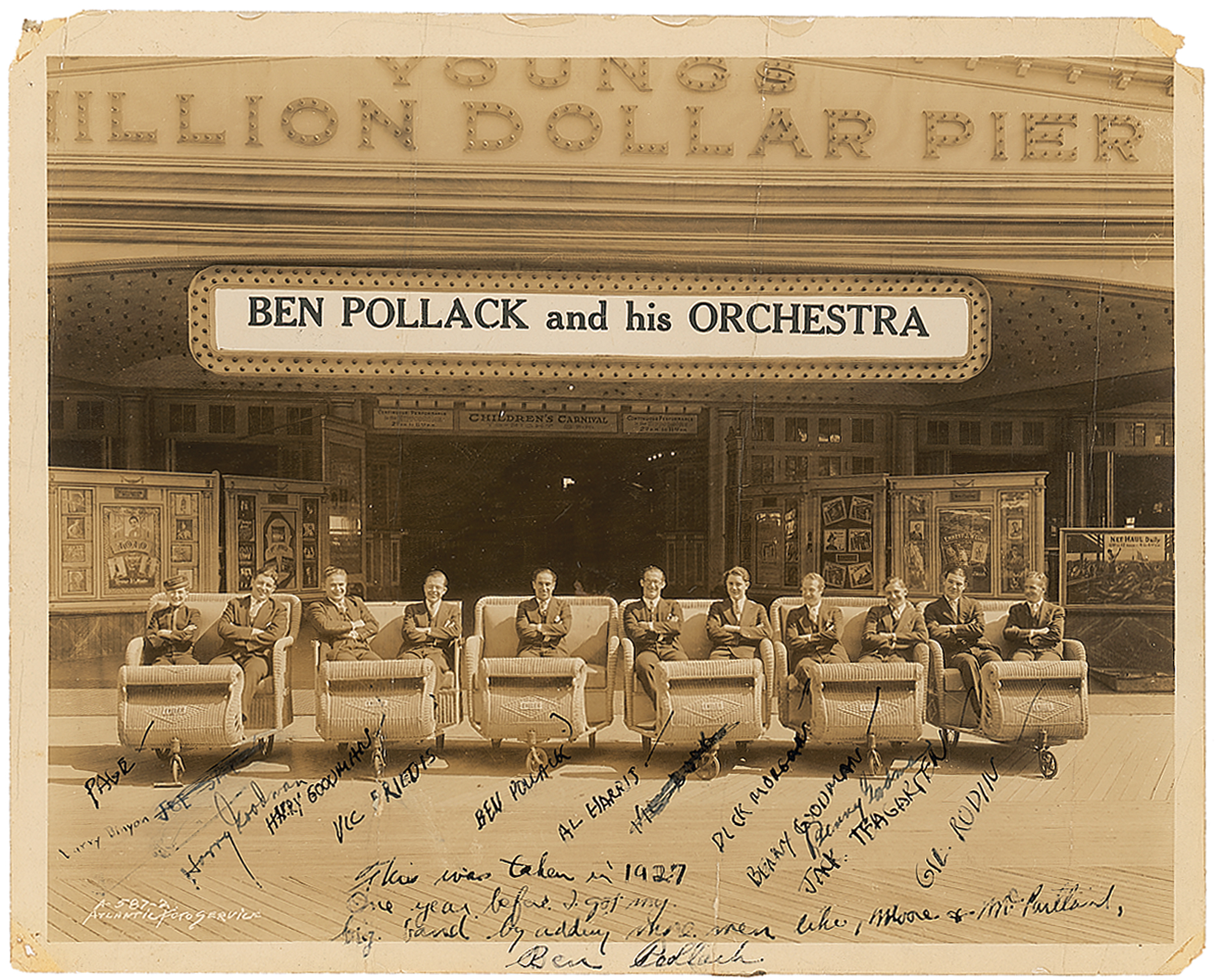 Drummer and bandleader (1903–1971) known as the 'Father of Swing,' who discovered or employed such greats as Benny Goodman, Jack Teagarden, Glenn Miller, Jimmy McPartland, and Harry James. Vintage glossy 10 x 8 photo of Ben Pollack and his Orchestra, signed in fountain pen by Harry Goodman, Benny Goodman, and Pollack, who writes, "This was taken in 1927, one year before I got my big band by adding more men like Moore & McPartland." All members of the band are labeled in an unknown hand. In very good condition, with three heavy vertical folds, a few other creases, and small tack holes and paper loss to corners.