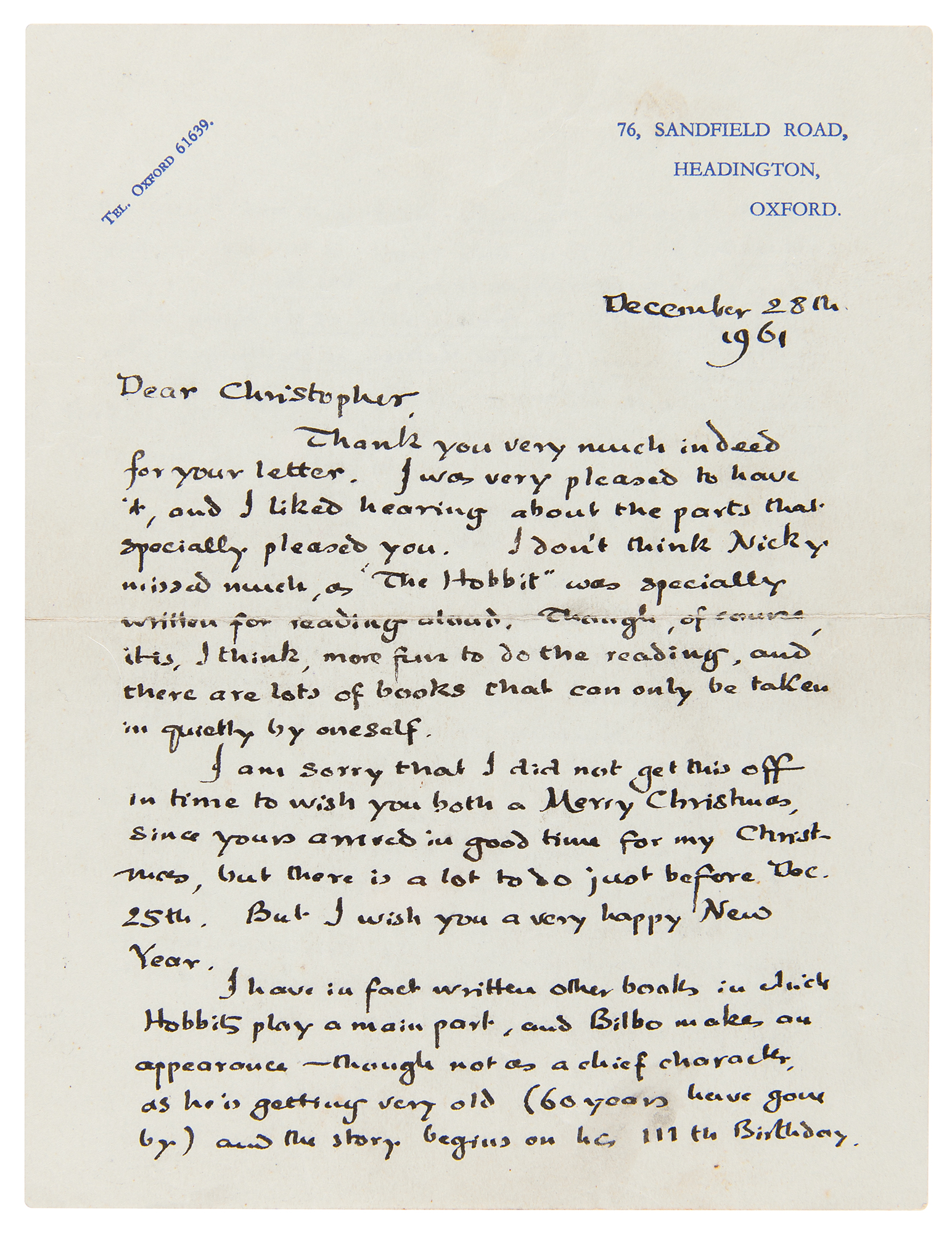 Magnificent ALS, one page both sides, 5.25 x 7, personal 76 Sandfield Road (Headington, Oxford) letterhead, December 28, 1961. Beautifully penned handwritten letter to eight-year-old fan Christopher Howard, in full: “Thank you very much indeed for your letter. I was very pleased to have it, and I liked learning about the parts that specially pleased you. I don’t think Nicky missed much, as ‘The Hobbit’ was specially written for reading aloud. Though, of course, it is, I think, more fun to do the reading, and there are lots of books that can only be taken in quietly by oneself.